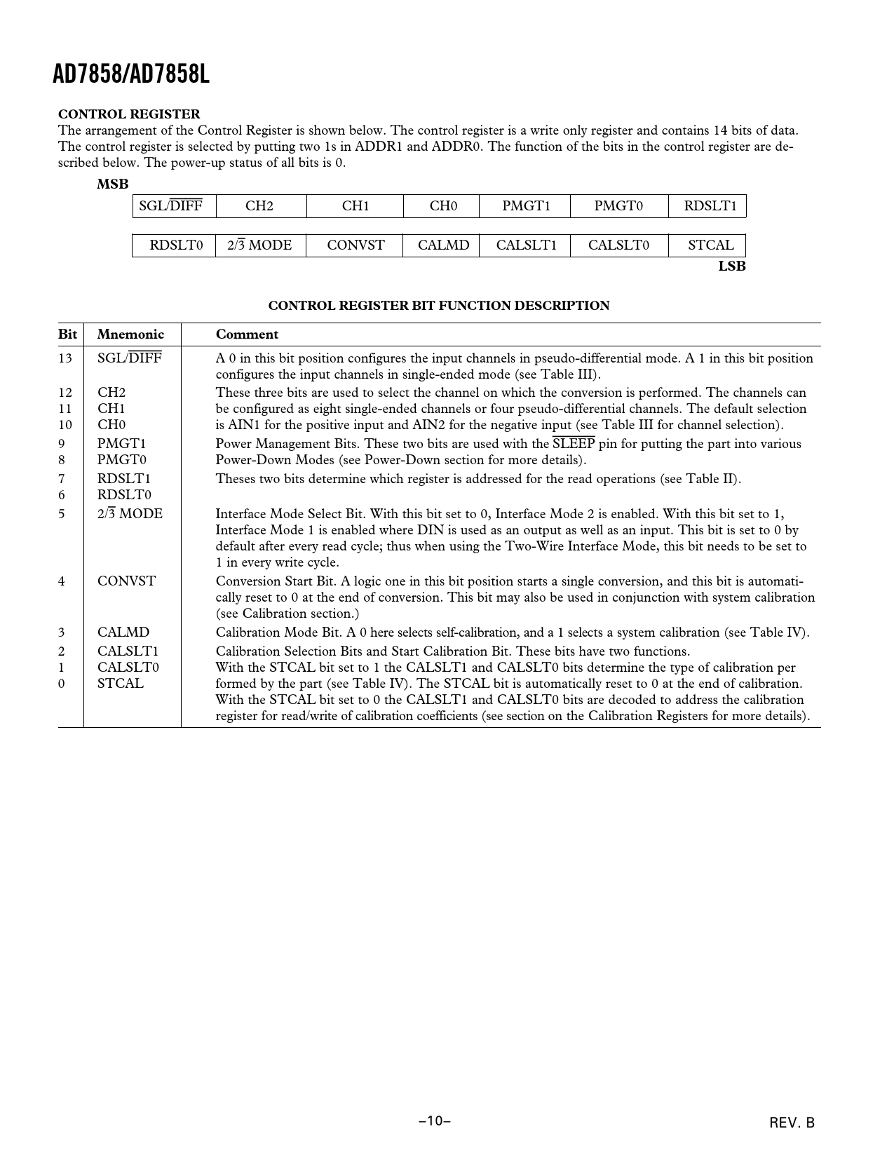 AD7858/AD7858L CONTROL REGISTER MSB LSB CONTROL REGISTER BIT FUNCTION DESCRIPTION Bit Mnemonic Comment