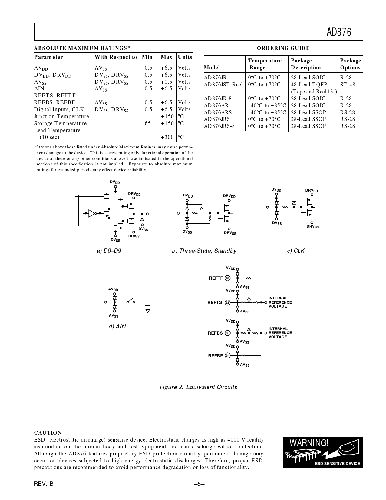 accumulate on the human body and test equipment and can discharge without detection. Although the AD876 features proprietary ESD protection circuitry, permanent damage may occur on devices subjected to high energy electrostatic discharges. Therefore, proper ESD