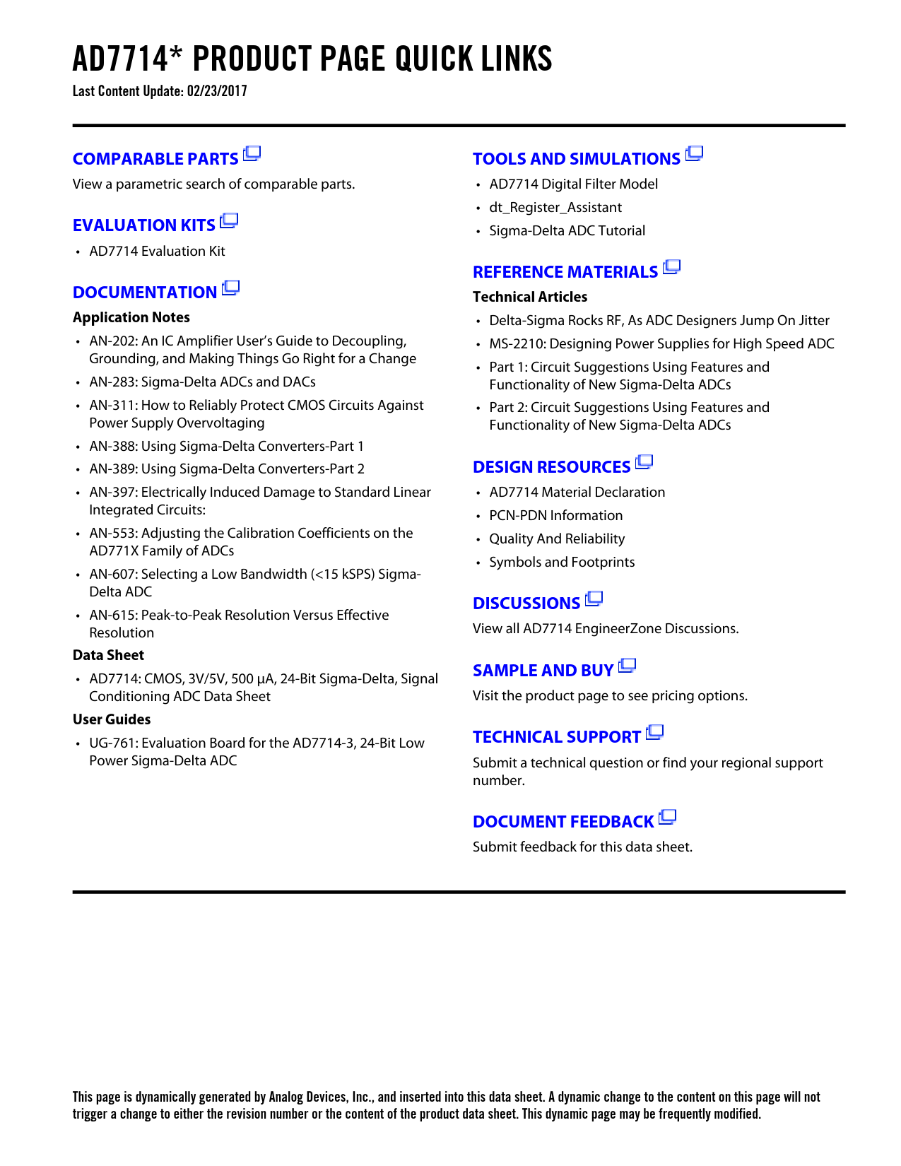 AD7714* PRODUCT PAGE QUICK LINKS Last Content Update: 02/23/2017 COMPARABLE PARTS TOOLS AND SIMULATIONS