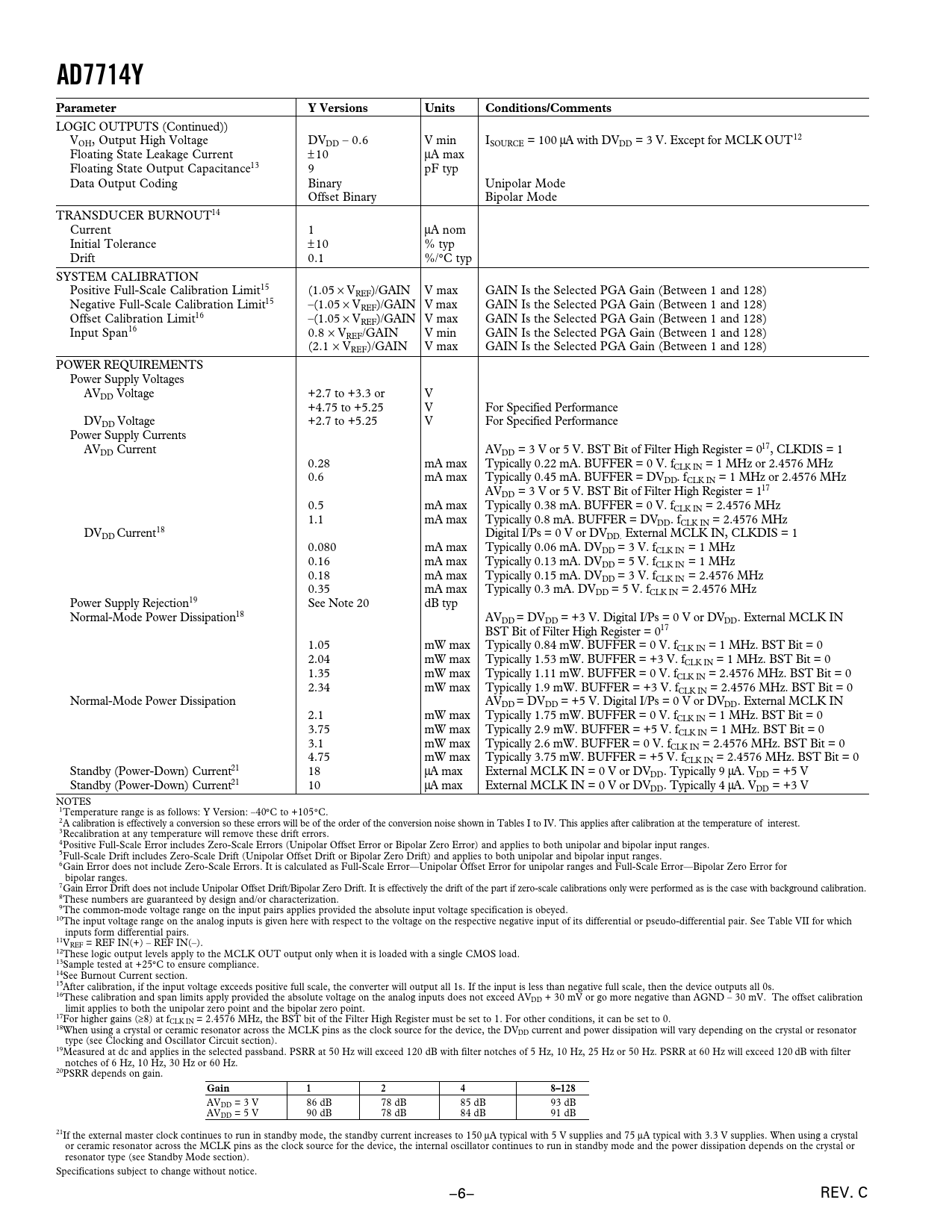 AD7714Y Parameter Y Versions Units Conditions/Comments Gain 8–128