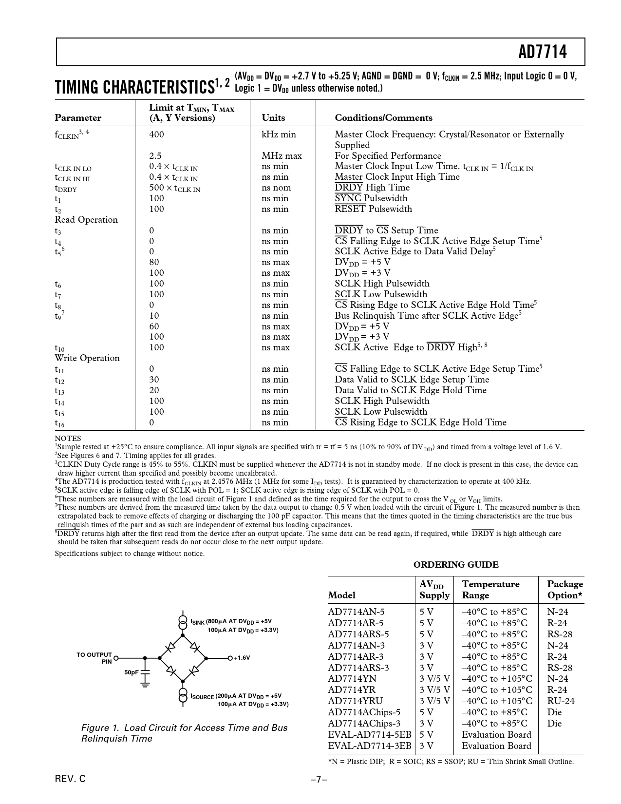AD7714(AVDD = DVDD = +2.7 V to +5.25 V; AGND = DGND = 0 V; fCLKIN = 2.5␣ MHz; Input Logic 0 = 0 V,TIMING CHARACTERISTICS1, 2 Logic 1 = DVDD unless otherwise noted.)Limit at TMIN, TMAXParameter(A, Y Versions)UnitsConditions/Comments f 3, 4 CLKIN 400 kHz min Master Clock Frequency: Crystal/Resonator or Externally Supplied 2.5 MHz max For Specified Performance 2 tCLK IN LO 0.4 × tCLK IN ns min Master Clock Input Low Time. tCLK IN = 1/fCLK IN tCLK IN HI 0.4 × tCLK IN ns min Master Clock Input High Time tDRDY 500 × tCLK IN ns nom DRDY High Time t1 100 ns min SYNC Pulsewidth t2 100 ns min RESET Pulsewidth Read Operation t3 0 ns min DRDY to CS Setup Time t4 0 ns min CS Falling Edge to SCLK Active Edge Setup Time5 t 6 5 0 ns min SCLK Active Edge to Data Valid Delay5 80 ns max DVDD = +5␣ V 100 ns max DVDD = +3␣ V t6 100 ns min SCLK High Pulsewidth t7 100 ns min SCLK Low Pulsewidth t8 0 ns min CS Rising Edge to SCLK Active Edge Hold Time5 t 7 9 10 ns min Bus Relinquish Time after SCLK Active Edge5 60 ns max DVDD = +5␣ V 100 ns max DVDD = +3␣ V t10 100 ns max SCLK Active Edge to DRDY High5, 8 Write Operation t11 0 ns min CS Falling Edge to SCLK Active Edge Setup Time5 t12 30 ns min Data Valid to SCLK Edge Setup Time t13 20 ns min Data Valid to SCLK Edge Hold Time t14 100 ns min SCLK High Pulsewidth t15 100 ns min SCLK Low Pulsewidth t16 0 ns min CS Rising Edge to SCLK Edge Hold Time NOTES 1Sample tested at +25°C to ensure compliance. All input signals are specified with tr = tf = 5 ns (10% to 90% of DV DD) and timed from a voltage level of 1.6 V. 2See Figures 6 and 7. Timing applies for all grades. 3CLKIN Duty Cycle range is 45% to 55%. CLKIN must be supplied whenever the AD7714 is not in standby mode. If no clock is present in this case, the device can draw higher current than specified and possibly become uncalibrated. 4The AD7714 is production tested with fCLKIN at 2.4576␣ MHz (1␣ MHz for some IDD tests). It is guaranteed by characterization to operate at 400␣ kHz. 5SCLK active edge is falling edge of SCLK with POL = 1; SCLK active edge is rising edge of SCLK with POL = 0. 6These numbers are measured with the load circuit of Figure 1 and defined as the time required for the output to cross the V OL or VOH limits. 7These numbers are derived from the measured time taken by the data output to change 0.5␣ V when loaded with the circuit of Figure 1. The measured number is then extrapolated back to remove effects of charging or discharging the 100 pF capacitor. This means that the times quoted in the timing characteristics are the true bus relinquish times of the part and as such are independent of external bus loading capacitances. 8DRDY returns high after the first read from the device after an output update. The same data can be read again, if required, while DRDY is high although care should be taken that subsequent reads do not occur close to the next output update. Specifications subject to change without notice. ORDERING GUIDEAVDDTemperaturePackageModelSupplyRangeOption* AD7714AN-5 5 V –40°C to +85°C N-24 ISINK (800 m A AT DVDD = +5V AD7714AR-5 5 V –40°C to +85°C R-24 100 m A AT DVDD = +3.3V) AD7714ARS-5 5 V –40°C to +85°C RS-28 AD7714AN-3 3 V –40°C to +85°C N-24 TO OUTPUT+1.6V AD7714AR-3 3 V –40°C to +85°C R-24 PIN AD7714ARS-3 3 V –40°C to +85°C RS-28 50pF AD7714YN 3 V/5 V –40°C to +105°C N-24 AD7714YR 3 V/5 V –40°C to +105°C R-24 ISOURCE (200 m A AT DVDD = +5V AD7714YRU 3 V/5 V –40 100 m A AT DV °C to +105°C RU-24 DD = +3.3V) AD7714AChips-5 5 V –40°C to +85°C Die AD7714AChips-3 3 V –40°C to +85°C Die Figure 1. Load Circuit for Access Time and Bus EVAL-AD7714-5EB 5 V Evaluation Board Relinquish Time EVAL-AD7714-3EB 3 V Evaluation Board *N = Plastic DIP; R = SOIC; RS = SSOP; RU = Thin Shrink Small Outline. REV. C –7–