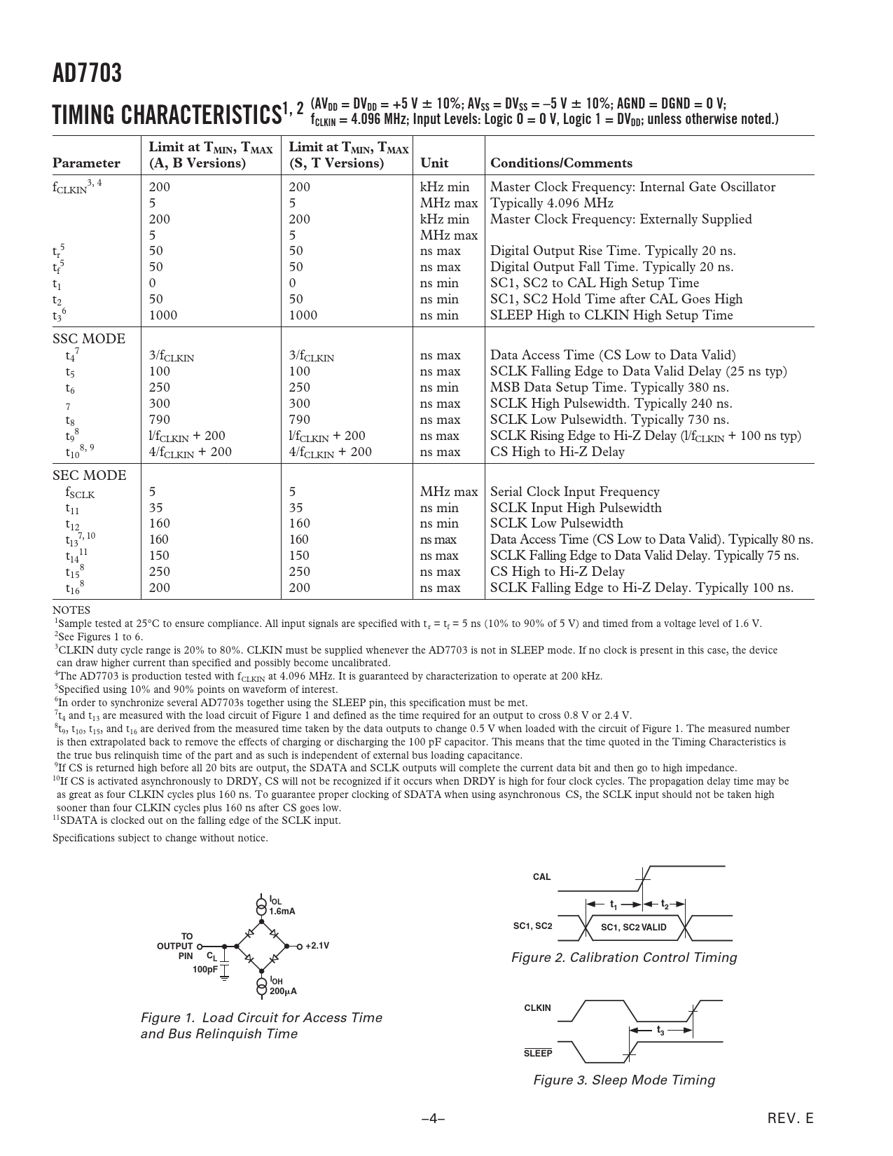 f 3, 4 CLKIN 200 200 kHz min Master Clock Frequency: Internal Gate Oscillator 5 5 MHz max Typically 4.096 MHz 200 200 kHz min Master Clock Frequency: Externally Supplied 5 5 MHz max t 5 r 50 50 ns max Digital Output Rise Time. Typically 20 ns. t 5 f 50 50 ns max Digital Output Fall Time. Typically 20 ns. t1 0 0 ns min SC1, SC2 to CAL High Setup Time t2 50 50 ns min SC1, SC2 Hold Time after CAL Goes High t 6 3 1000 1000 ns min SLEEP High to CLKIN High Setup Time SSC MODE t 7 4 3/fCLKIN 3/fCLKIN ns max Data Access Time (CS Low to Data Valid) t5 100 100 ns max SCLK Falling Edge to Data Valid Delay (25 ns typ) t6 250 250 ns min MSB Data Setup Time. Typically 380 ns. 7 300 300 ns max SCLK High Pulsewidth. Typically 240 ns. t8 790 790 ns max SCLK Low Pulsewidth. Typically 730 ns. t 8 9 l/fCLKIN + 200 l/fCLKIN + 200 ns max SCLK Rising Edge to Hi-Z Delay (l/fCLKIN + 100 ns typ) t 8, 9 10 4/fCLKIN + 200 4/fCLKIN + 200 ns max CS High to Hi-Z Delay SEC MODE fSCLK 5 5 MHz max Serial Clock Input Frequency t11 35 35 ns min SCLK Input High Pulsewidth t12 160 160 ns min SCLK Low Pulsewidth t 7, 10 13 160 160 ns max Data Access Time (CS Low to Data Valid). Typically 80 ns. t 11 14 150 150 ns max SCLK Falling Edge to Data Valid Delay. Typically 75 ns. t 8 15 250 250 ns max CS High to Hi-Z Delay t 8 16 200 200 ns max SCLK Falling Edge to Hi-Z Delay. Typically 100 ns. NOTES 1Sample tested at 25°C to ensure compliance. All input signals are specified with t r = tf = 5 ns (10% to 90% of 5 V) and timed from a voltage level of 1.6 V. 2See Figures 1 to 6. 3CLKIN duty cycle range is 20% to 80%. CLKIN must be supplied whenever the AD7703 is not in SLEEP mode. If no clock is present in this case, the device can draw higher current than specified and possibly become uncalibrated. 4The AD7703 is production tested with fCLKIN at 4.096 MHz. It is guaranteed by characterization to operate at 200 kHz. 5Specified using 10% and 90% points on waveform of interest. 6In order to synchronize several AD7703s together using the SLEEP pin, this specification must be met. 7t4 and t13 are measured with the load circuit of Figure 1 and defined as the time required for an output to cross 0.8 V or 2.4 V. 8t9, t10, t15, and t16 are derived from the measured time taken by the data outputs to change 0.5 V when loaded with the circuit of Figure 1. The measured number is then extrapolated back to remove the effects of charging or discharging the 100 pF capacitor. This means that the time quoted in the Timing Characteristics is the true bus relinquish time of the part and as such is independent of external bus loading capacitance. 9If CS is returned high before all 20 bits are output, the SDATA and SCLK outputs will complete the current data bit and then go to high impedance. 10If CS is activated asynchronously to DRDY, CS will not be recognized if it occurs when DRDY is high for four clock cycles. The propagation delay time may be as great as four CLKIN cycles plus 160 ns. To guarantee proper clocking of SDATA when using asynchronous CS, the SCLK input should not be taken high sooner than four CLKIN cycles plus 160 ns after CS goes low. 11SDATA is clocked out on the falling edge of the SCLK input. Specifications subject to change without notice.