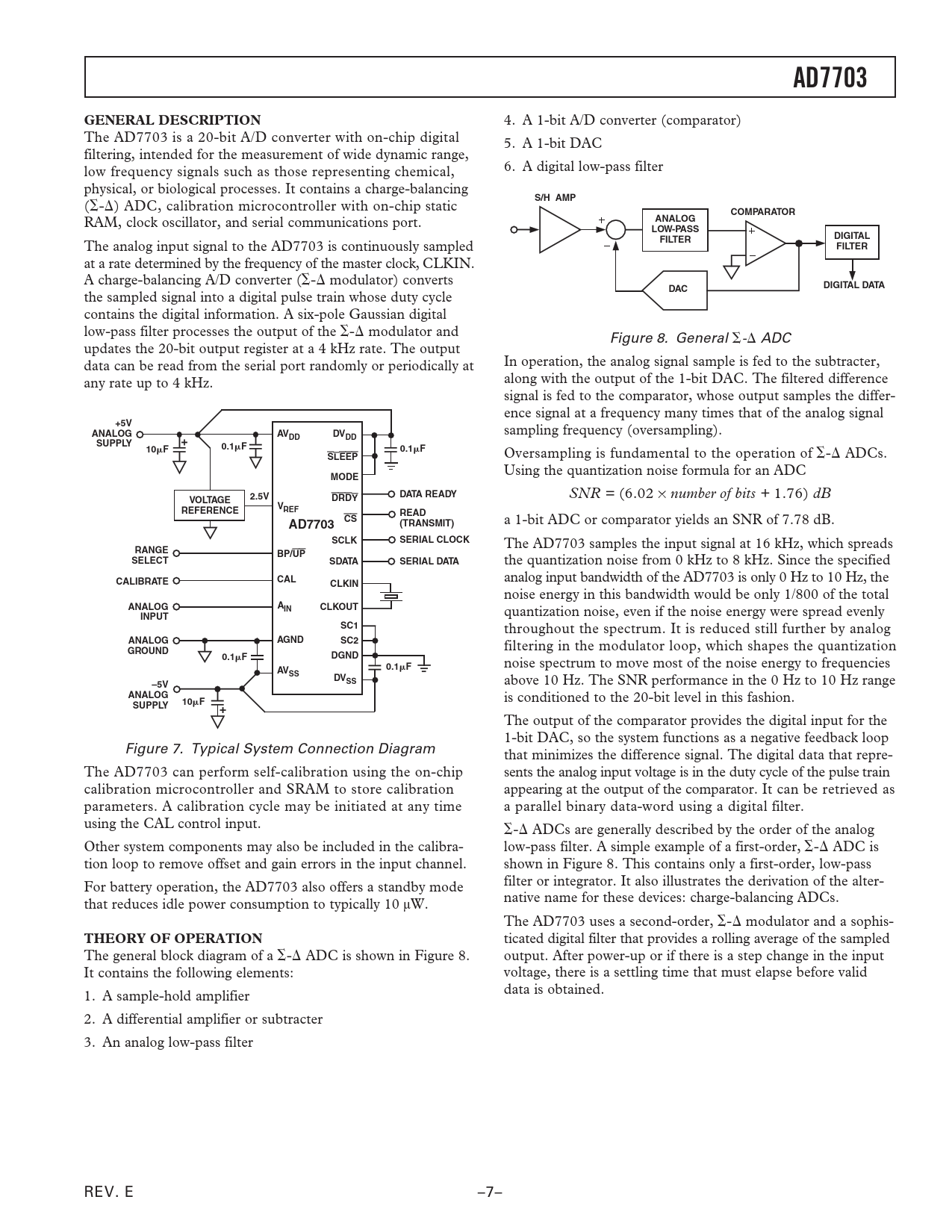 AD7703GENERAL DESCRIPTION 4. A 1-bit A/D converter (comparator) The AD7703 is a 20-bit A/D converter with on-chip digital 5. A 1-bit DAC filtering, intended for the measurement of wide dynamic range, low frequency signals such as those representing chemical, 6. A digital low-pass filter physical, or biological processes. It contains a charge-balancing S/H AMP (⌺-⌬) ADC, calibration microcontroller with on-chip static COMPARATOR RAM, clock oscillator, and serial communications port. ANALOGLOW-PASSFILTERDIGITAL The analog input signal to the AD7703 is continuously sampled FILTER at a rate determined by the frequency of the master clock, CLKIN. A charge-balancing A/D converter (⌺-⌬ modulator) converts DIGITAL DATADAC the sampled signal into a digital pulse train whose duty cycle contains the digital information. A six-pole Gaussian digital low-pass filter processes the output of the ⌺-⌬ modulator and Figure 8. General ⌺-⌬ ADC updates the 20-bit output register at a 4 kHz rate. The output data can be read from the serial port randomly or periodically at In operation, the analog signal sample is fed to the subtracter, any rate up to 4 kHz. along with the output of the 1-bit DAC. The filtered difference signal is fed to the comparator, whose output samples the differ- ence signal at a frequency many times that of the analog signal +5VANALOGAVDV sampling frequency (oversampling). DDDDSUPPLY0.1 F10 F0.1 FSLEEP Oversampling is fundamental to the operation of ⌺-⌬ ADCs. Using the quantization noise formula for an ADC MODE2.5VDRDYDATA READY SNR = (6.02 ¥ number of bits + 1.76) dB VOLTAGEVREFREFERENCEREADCSAD7703(TRANSMIT) a 1-bit ADC or comparator yields an SNR of 7.78 dB. SCLKSERIAL CLOCK The AD7703 samples the input signal at 16 kHz, which spreads RANGEBP/UPSELECTSDATASERIAL DATA the quantization noise from 0 kHz to 8 kHz. Since the specified CALCALIBRATE analog input bandwidth of the AD7703 is only 0 Hz to 10 Hz, the CLKIN noise energy in this bandwidth would be only 1/800 of the total ANALOGAINCLKOUT quantization noise, even if the noise energy were spread evenly INPUTSC1 throughout the spectrum. It is reduced still further by analog ANALOGAGNDSC2 filtering in the modulator loop, which shapes the quantization GROUND0.1DGND F0.1 F noise spectrum to move most of the noise energy to frequencies AVSSDVSS above 10 Hz. The SNR performance in the 0 Hz to 10 Hz range –5VANALOG is conditioned to the 20-bit level in this fashion. SUPPLY10 F The output of the comparator provides the digital input for the 1-bit DAC, so the system functions as a negative feedback loop Figure 7. Typical System Connection Diagram that minimizes the difference signal. The digital data that repre- The AD7703 can perform self-calibration using the on-chip sents the analog input voltage is in the duty cycle of the pulse train calibration microcontroller and SRAM to store calibration appearing at the output of the comparator. It can be retrieved as parameters. A calibration cycle may be initiated at any time a parallel binary data-word using a digital filter. using the CAL control input. ⌺-⌬ ADCs are generally described by the order of the analog Other system components may also be included in the calibra- low-pass filter. A simple example of a first-order, ⌺-⌬ ADC is tion loop to remove offset and gain errors in the input channel. shown in Figure 8. This contains only a first-order, low-pass For battery operation, the AD7703 also offers a standby mode filter or integrator. It also illustrates the derivation of the alter- that reduces idle power consumption to typically 10 µW. native name for these devices: charge-balancing ADCs. The AD7703 uses a second-order, ⌺-⌬ modulator and a sophis- THEORY OF OPERATION ticated digital filter that provides a rolling average of the sampled The general block diagram of a ⌺-⌬ ADC is shown in Figure 8. output. After power-up or if there is a step change in the input It contains the following elements: voltage, there is a settling time that must elapse before valid 1. A sample-hold amplifier data is obtained. 2. A differential amplifier or subtracter 3. An analog low-pass filter REV. E –7– Document Outline FEATURES APPLICATIONS GENERAL DESCRIPTION FUNCTIONAL BLOCK DIAGRAM PRODUCT HIGHLIGHTS SPECIFICATIONS ABSOLUTE MAXIMUM RATINGS ORDERING GUIDE TIMING CHARACTERISTICS DEFINITION OF TERMS Linearity Error Differential Linearity Error Positive Full-Scale Error Unipolar Offset Error Bipolar Zero Error Bipolar Negative Full-Scale Error Positive Full-Scale Overrange Negative Full-Scale Overrange Offset Calibration Range Full-Scale Calibration Range Input Span PIN CONFIGURATION DIP, CERDIP, SOIC PIN FUNCTION DESCRIPTIONS GENERAL DESCRIPTION THEORY OF OPERATION DIGITAL FILTERING FILTER CHARACTERISTICS USING THE AD7703 SYSTEM DESIGN CONSIDERATIONS CLOCKING ANALOG INPUT RANGES ACCURACY AUTOCALIBRATION Initiating Calibration Span and Offset Limits POWER-UP AND CALIBRATION Drift Considerations INPUT SIGNAL CONDITIONING Source Resistance Antialias Considerations VOLTAGE REFERENCE CONNECTIONS POWER SUPPLIES AND GROUNDING SLEEP MODE DIGITAL INTERFACE Synchronous Self-Clocking Mode (SSC) Synchronous External Clock Mode (SEC) DIGITAL NOISE AND OUTPUT LOADING OUTLINE DIMENSIONS REVISION HISTORY
