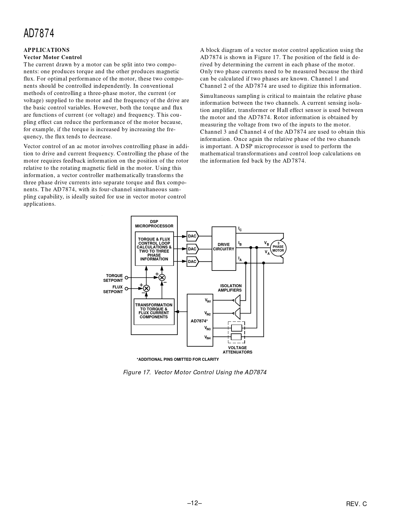 AD7874APPLICATIONS A block diagram of a vector motor control application using the Vector Motor Control AD7874 is shown in Figure 17. The position of the field is de- The current drawn by a motor can be split into two compo- rived by determining the current in each phase of the motor. nents: one produces torque and the other produces magnetic Only two phase currents need to be measured because the third flux. For optimal performance of the motor, these two compo- can be calculated if two phases are known. Channel 1 and nents should be controlled independently. In conventional Channel 2 of the AD7874 are used to digitize this information. methods of controlling a three-phase motor, the current (or Simultaneous sampling is critical to maintain the relative phase voltage) supplied to the motor and the frequency of the drive are information between the two channels. A current sensing isola- the basic control variables. However, both the torque and flux tion amplifier, transformer or Hall effect sensor is used between are functions of current (or voltage) and frequency. This cou- the motor and the AD7874. Rotor information is obtained by pling effect can reduce the performance of the motor because, measuring the voltage from two of the inputs to the motor. for example, if the torque is increased by increasing the fre- Channel 3 and Channel 4 of the AD7874 are used to obtain this quency, the flux tends to decrease. information. Once again the relative phase of the two channels Vector control of an ac motor involves controlling phase in addi- is important. A DSP microprocessor is used to perform the tion to drive and current frequency. Controlling the phase of the mathematical transformations and control loop calculations on motor requires feedback information on the position of the rotor the information fed back by the AD7874. relative to the rotating magnetic field in the motor. Using this information, a vector controller mathematically transforms the three phase drive currents into separate torque and flux compo- nents. The AD7874, with its four-channel simultaneous sam- pling capability, is ideally suited for use in vector motor control applications. DSPMICROPROCESSORICDACTORQUE & FLUXCONTROL LOOPIVDRIVEBB3CALCULATIONS &PHASEDACCIRCUITRYTWO TO THREEVMOTORPHASEAINFORMATIONIDACATORQUESETPOINTFLUXISOLATIONSETPOINTAMPLIFIERSVIN1TRANSFORMATIONTO TORQUE &FLUX CURRENTVIN2COMPONENTSAD7874*VIN3VIN4VOLTAGEATTENUATORS*ADDITIONAL PINS OMITTED FOR CLARITY Figure 17. Vector Motor Control Using the AD7874 –12– REV. C
