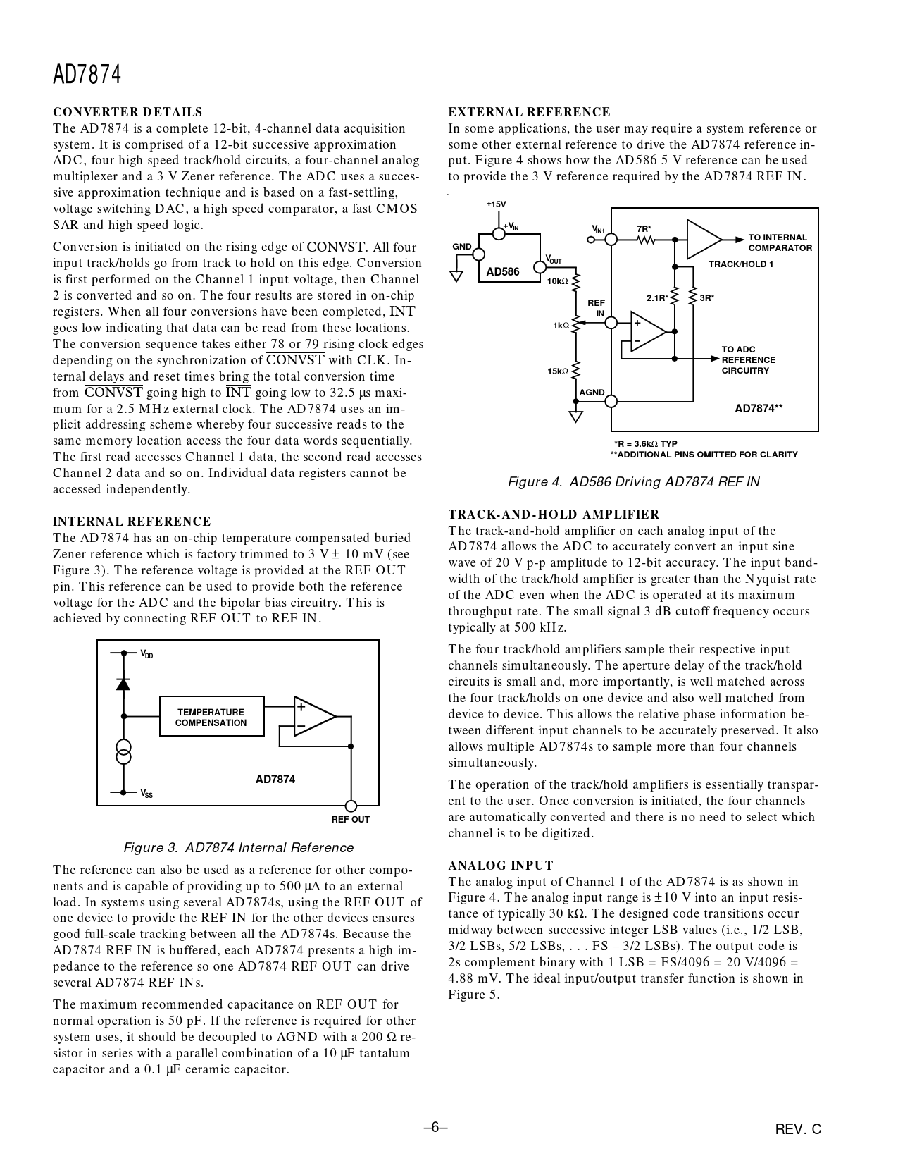 AD7874CONVERTER DETAILSEXTERNAL REFERENCE The AD7874 is a complete 12-bit, 4-channel data acquisition In some applications, the user may require a system reference or system. It is comprised of a 12-bit successive approximation some other external reference to drive the AD7874 reference in- ADC, four high speed track/hold circuits, a four-channel analog put. Figure 4 shows how the AD586 5 V reference can be used multiplexer and a 3 V Zener reference. The ADC uses a succes- to provide the 3 V reference required by the AD7874 REF IN. sive approximation technique and is based on a fast-settling, voltage switching DAC, a high speed comparator, a fast CMOS 15V+ SAR and high speed logic. +VINVIN17R*TO INTERNAL Conversion is initiated on the rising edge of CONVST. All four GNDCOMPARATOR input track/holds go from track to hold on this edge. Conversion VOUTTRACK/HOLD 1AD586 is first performed on the Channel 1 input voltage, then Channel 10k Ω 2 is converted and so on. The four results are stored in on-chip 2.1R*3R*REF registers. When all four conversions have been completed, INT IN goes low indicating that data can be read from these locations. 1k Ω The conversion sequence takes either 78 or 79 rising clock edges TO ADC depending on the synchronization of CONVST with CLK. In- REFERENCE ternal delays and reset times bring the total conversion time 15k Ω CIRCUITRY from CONVST going high to INT going low to 32.5 µs maxi- AGND mum for a 2.5 MHz external clock. The AD7874 uses an im- AD7874** plicit addressing scheme whereby four successive reads to the same memory location access the four data words sequentially. *R = 3.6k Ω TYP The first read accesses Channel 1 data, the second read accesses **ADDITIONAL PINS OMITTED FOR CLARITY Channel 2 data and so on. Individual data registers cannot be Figure 4. AD586 Driving AD7874 REF IN accessed independently. TRACK-AND-HOLD AMPLIFIERINTERNAL REFERENCE The track-and-hold amplifier on each analog input of the The AD7874 has an on-chip temperature compensated buried AD7874 allows the ADC to accurately convert an input sine Zener reference which is factory trimmed to 3 V ± 10 mV (see wave of 20 V p-p amplitude to 12-bit accuracy. The input band- Figure 3). The reference voltage is provided at the REF OUT width of the track/hold amplifier is greater than the Nyquist rate pin. This reference can be used to provide both the reference of the ADC even when the ADC is operated at its maximum voltage for the ADC and the bipolar bias circuitry. This is throughput rate. The small signal 3 dB cutoff frequency occurs achieved by connecting REF OUT to REF IN. typically at 500 kHz. V The four track/hold amplifiers sample their respective input DD channels simultaneously. The aperture delay of the track/hold circuits is small and, more importantly, is well matched across the four track/holds on one device and also well matched from TEMPERATURE device to device. This allows the relative phase information be- COMPENSATION tween different input channels to be accurately preserved. It also allows multiple AD7874s to sample more than four channels simultaneously. AD7874 The operation of the track/hold amplifiers is essentially transpar- VSS ent to the user. Once conversion is initiated, the four channels REF OUT are automatically converted and there is no need to select which channel is to be digitized. Figure 3. AD7874 Internal Reference The reference can also be used as a reference for other compo- ANALOG INPUT nents and is capable of providing up to 500 µA to an external The analog input of Channel 1 of the AD7874 is as shown in load. In systems using several AD7874s, using the REF OUT of Figure 4. The analog input range is ± 10 V into an input resis- one device to provide the REF IN for the other devices ensures tance of typically 30 kΩ. The designed code transitions occur good full-scale tracking between all the AD7874s. Because the midway between successive integer LSB values (i.e., 1/2 LSB, AD7874 REF IN is buffered, each AD7874 presents a high im- 3/2 LSBs, 5/2 LSBs, . FS – 3/2 LSBs). The output code is pedance to the reference so one AD7874 REF OUT can drive 2s complement binary with 1 LSB = FS/4096 = 20 V/4096 = several AD7874 REF INs. 4.88 mV. The ideal input/output transfer function is shown in Figure 5. The maximum recommended capacitance on REF OUT for normal operation is 50 pF. If the reference is required for other system uses, it should be decoupled to AGND with a 200 Ω re- sistor in series with a parallel combination of a 10 µF tantalum capacitor and a 0.1 µF ceramic capacitor. –6– REV. C