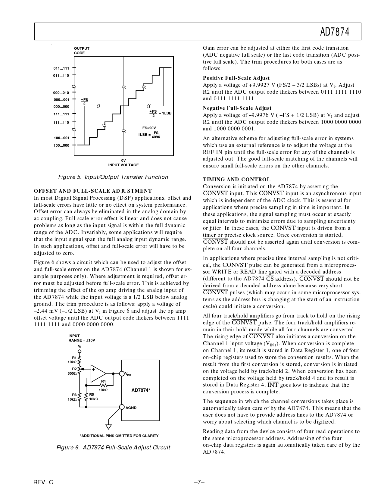 AD7874OUTPUT Gain error can be adjusted at either the first code transition CODE (ADC negative full scale) or the last code transition (ADC posi- tive full scale). The trim procedures for both cases are as 011...111 follows: 011...110Positive Full-Scale Adjust Apply a voltage of +9.9927 V (FS/2 – 3/2 LSBs) at V1. Adjust 000...010 R2 until the ADC output code flickers between 0111 1111 1110 000...001– FS and 0111 1111 1111. 2000...000Negative Full-Scale Adjust+ FS111...111– 1LSB2 Apply a voltage of –9.9976 V ( –FS + 1/2 LSB) at V1 and adjust 111...110 R2 until the ADC output code flickers between 1000 0000 0000 FS=20V and 1000 0000 0001. FS1LSB = 4096100...001 An alternative scheme for adjusting full-scale error in systems 100...000 which use an external reference is to adjust the voltage at the REF IN pin until the full-scale error for any of the channels is 0V adjusted out. The good full-scale matching of the channels will INPUT VOLTAGE ensure small full-scale errors on the other channels. Figure 5. Input/Output Transfer Function TIMING AND CONTROL Conversion is initiated on the AD7874 by asserting the OFFSET AND FULL-SCALE ADJUSTMENT CONVST input. This CONVST input is an asynchronous input In most Digital Signal Processing (DSP) applications, offset and which is independent of the ADC clock. This is essential for full-scale errors have little or no effect on system performance. applications where precise sampling in time is important. In Offset error can always be eliminated in the analog domain by these applications, the signal sampling must occur at exactly ac coupling. Full-scale error effect is linear and does not cause equal intervals to minimize errors due to sampling uncertainty problems as long as the input signal is within the full dynamic or jitter. In these cases, the CONVST input is driven from a range of the ADC. Invariably, some applications will require timer or precise clock source. Once conversion is started, that the input signal span the full analog input dynamic range. CONVST should not be asserted again until conversion is com- In such applications, offset and full-scale error will have to be plete on all four channels. adjusted to zero. In applications where precise time interval sampling is not criti- Figure 6 shows a circuit which can be used to adjust the offset cal, the CONVST pulse can be generated from a microproces- and full-scale errors on the AD7874 (Channel 1 is shown for ex- sor WRITE or READ line gated with a decoded address ample purposes only). Where adjustment is required, offset er- (different to the AD7874 CS address). CONVST should not be ror must be adjusted before full-scale error. This is achieved by derived from a decoded address alone because very short trimming the offset of the op amp driving the analog input of CONVST pulses (which may occur in some microprocessor sys- the AD7874 while the input voltage is a 1/2 LSB below analog tems as the address bus is changing at the start of an instruction ground. The trim procedure is as follows: apply a voltage of cycle) could initiate a conversion. –2.44 mV (–1/2 LSB) at V1 in Figure 6 and adjust the op amp offset voltage until the ADC output code flickers between 1111 All four track/hold amplifiers go from track to hold on the rising 1111 1111 and 0000 0000 0000. edge of the CONVST pulse. The four track/hold amplifiers re- main in their hold mode while all four channels are converted. INPUT The rising edge of CONVST also initiates a conversion on the RANGE = ± 10V Channel 1 input voltage (V V IN1). When conversion is complete 1 on Channel 1, its result is stored in Data Register 1, one of four R1 on-chip registers used to store the conversion results. When the 10k Ω result from the first conversion is stored, conversion is initiated R2 on the voltage held by track/hold 2. When conversion has been 500 Ω VIN1 completed on the voltage held by track/hold 4 and its result is R4 stored in Data Register 4, INT goes low to indicate that the 10k Ω AD7874* conversion process is complete. R3R510k Ω 10k Ω The sequence in which the channel conversions takes place is AGND automatically taken care of by the AD7874. This means that the user does not have to provide address lines to the AD7874 or worry about selecting which channel is to be digitized. Reading data from the device consists of four read operations to *ADDITIONAL PINS OMITTED FOR CLARITY the same microprocessor address. Addressing of the four Figure 6. AD7874 Full-Scale Adjust Circuit on-chip data registers is again automatically taken care of by the AD7874. REV. C –7–