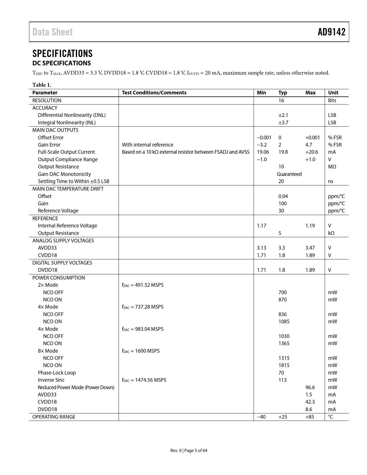 Data SheetAD9142SPECIFICATIONS DC SPECIFICATIONS TMIN to TMAX, AVDD33 = 3.3 V, DVDD18 = 1.8 V, CVDD18 = 1.8 V, IOUTFS = 20 mA, maximum sample rate, unless otherwise noted. Table 1. ParameterTest Conditions/CommentsMinTypMaxUnit RESOLUTION 16 Bits ACCURACY Differential Nonlinearity (DNL) ±2.1 LSB Integral Nonlinearity (INL) ±3.7 LSB MAIN DAC OUTPUTS Offset Error −0.001 0 +0.001 % FSR Gain Error With internal reference −3.2 2 4.7 % FSR Full-Scale Output Current Based on a 10 kΩ external resistor between FSADJ and AVSS 19.06 19.8 +20.6 mA Output Compliance Range −1.0 +1.0 V Output Resistance 10 MΩ Gain DAC Monotonicity Guaranteed Settling Time to Within ±0.5 LSB 20 ns MAIN DAC TEMPERATURE DRIFT Offset 0.04 ppm/°C Gain 100 ppm/°C Reference Voltage 30 ppm/°C REFERENCE Internal Reference Voltage 1.17 1.19 V Output Resistance 5 kΩ ANALOG SUPPLY VOLTAGES AVDD33 3.13 3.3 3.47 V CVDD18 1.71 1.8 1.89 V DIGITAL SUPPLY VOLTAGES DVDD18 1.71 1.8 1.89 V POWER CONSUMPTION 2× Mode fDAC = 491.52 MSPS NCO OFF 700 mW NCO ON 870 mW 4× Mode fDAC = 737.28 MSPS NCO OFF 836 mW NCO ON 1085 mW 4× Mode fDAC = 983.04 MSPS NCO OFF 1030 mW NCO ON 1365 mW 8× Mode fDAC = 1600 MSPS NCO OFF 1315 mW NCO ON 1815 mW Phase-Lock Loop 70 mW Inverse Sinc fDAC = 1474.56 MSPS 113 mW Reduced Power Mode (Power Down) 96.6 mW AVDD33 1.5 mA CVDD18 42.3 mA DVDD18 8.6 mA OPERATING RANGE −40 +25 +85 °C Rev. 0 | Page 5 of 64 Document Outline Features Applications General Description Product Highlights Revision History Functional Block Diagram Specifications DC Specifications Digital Specifications DAC Latency Specifications Latency Variation Specifications0F AC Specifications Operating Speed Specifications Absolute Maximum Ratings Thermal Resistance ESD Caution Pin Configuration and Function Descriptions Typical Performance Characteristics Terminology Serial Port Operation Data Format Serial Port Pin Descriptions Serial Port Options Data Interface LVDS Input Data Ports Word Interface Mode Byte Interface Mode Data Interface Configuration Options LVDS Input Level Requirements Interface Delay Line Interface Timing Requirements SPI Sequence to Enable Delay Line-Based Mode FIFO Operation Resetting the FIFO Serial Port Initiated FIFO Reset Frame Initiated FIFO Reset Monitoring the FIFO Status Digital Datapath Interpolation Filters 2× Interpolation Mode 4× Interpolation Mode 8× Interpolation Mode Digital Modulation fS/4 Modulation NCO Modulation Updating the Frequency Tuning Word SPI Initiated Update Frame Initiated Update Datapath Configuration Digital Quadrature Gain and Phase Adjustment Quadrature Gain Adjustment Quadrature Phase Adjustment DC Offset Adjustment Inverse Sinc Filter Input Signal Power Detection and Protection Transmit Enable Function Digital Function Configuration Multidevice Synchronization and Fixed Latency Very Small Inherent Latency Variation Further Reducing the Latency Variation Set Up and Hold Timing Requirement Synchronization Implementation Synchronization Procedures Synchronization Procedure for PLL Off Synchronization Procedure for PLL On Interrupt Request Operation Interrupt Working Mechanism Interrupt Service Routine Temperature Sensor DAC Input Clock Configurations Driving the DACCLK and REFCLK Inputs Direct Clocking Clock Multiplication PLL Settings Configuring the VCO Tuning Band Automatic VCO Band Select Manual VCO Band Select Automatic Mode Sequence Manual Mode Analog Outputs Transmit DAC Operation Transmit DAC Transfer Function Transmit DAC Output Configurations Interfacing to Modulators Baseband Filter Implementation Reducing LO Leakage and Unwanted Sidebands Example Start-Up Routine Device Configuration and Start-Up Sequence Derived PLL Settings Derived NCO Settings Start-Up Sequence Device Configuration Register Map and Description SPI Configure Register Power-Down Control Register Interrupt Enable0 Register Interrupt Enable1 Register Interrupt Flag0 Register Interrupt Flag1 Register Interrupt Select0 Register Interrupt Select1 Register DAC Clock Receiver Control Register Ref Clock Receiver Control Register PLL Control Register PLL Control Register PLL Control Register PLL Status Register PLL Status Register IDAC FS Adjust LSB Register IDAC FS Adjust MSB Register QDAC FS Adjust LSB Register QDAC FS Adjust MSB Register Die Temperature Sensor Control Register Die Temperature LSB Register Die Temperature MSB Register Chip ID Register Interrupt Configuation Register Sync CTRL Register Frame Reset CTRL Register FIFO Level Configuration Register FIFO Level Readback Register FIFO CTRL Register Data Format Select Register Datapath Control Register Interpolation Control Register Over Threshold CTRL0 Register Over Threshold CTRL1 Register Over Threshold CTRL2 Register Input Power Readback LSB Register Input Power Readback MSB Register NCO Control Register NCO_FREQ_TUNING_WORD0 Register NCO_FREQ_TUNING_WORD1 Register NCO_FREQ_TUNING_WORD2 Register NCO_FREQ_TUNING_WORD3 Register NCO_PHASE_OFFSET0 Register NCO_PHASE_OFFSET1 Register IQ_PHASE_ADJ0 Register IQ_PHASE_ADJ1 Register IDAC_DC_OFFSET0 Register IDAC_DC_OFFSET1 Register QDAC_DC_OFFSET0 Register QDAC_DC_OFFSET1 Register IDAC_GAIN_ADJ Register QDAC_GAIN_ADJ Register Gain Step Control0 Register Gain Step Control1 Register TX Enable Control Register DAC Output Control Register Data Receiver Test Control Register Data Receiver Test Control Register Device Configuration0 Register Version Register Device Configuration1 Register Device Configuration2 Register DAC Latency and System Skews DAC Latency Variations FIFO Latency Variation Clock Generation Latency Variation Correcting System Skews Packaging and Ordering Information Outline Dimensions Ordering Guide