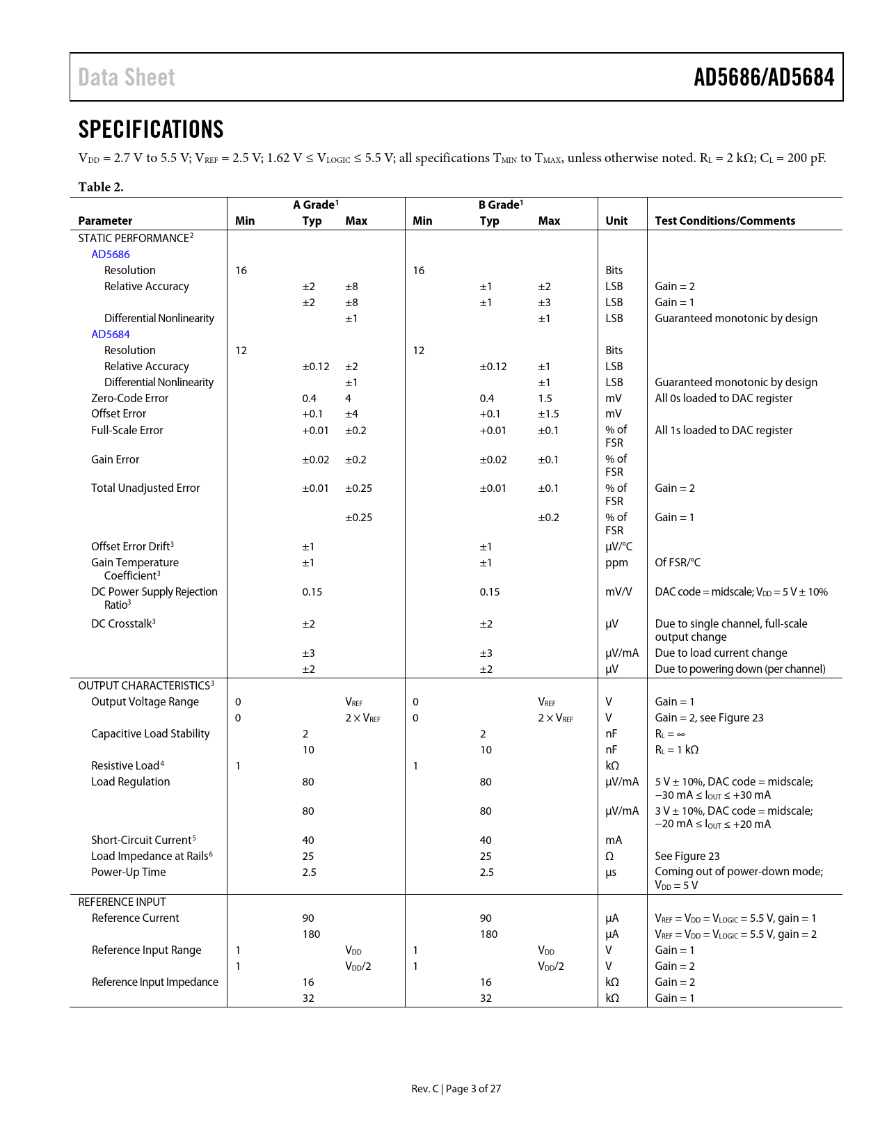 Pages / Page27 / 3 — Data Sheet. AD5686/AD5684. SPECIFICATIONS. Table 2. A Grade1. B Grade1. …