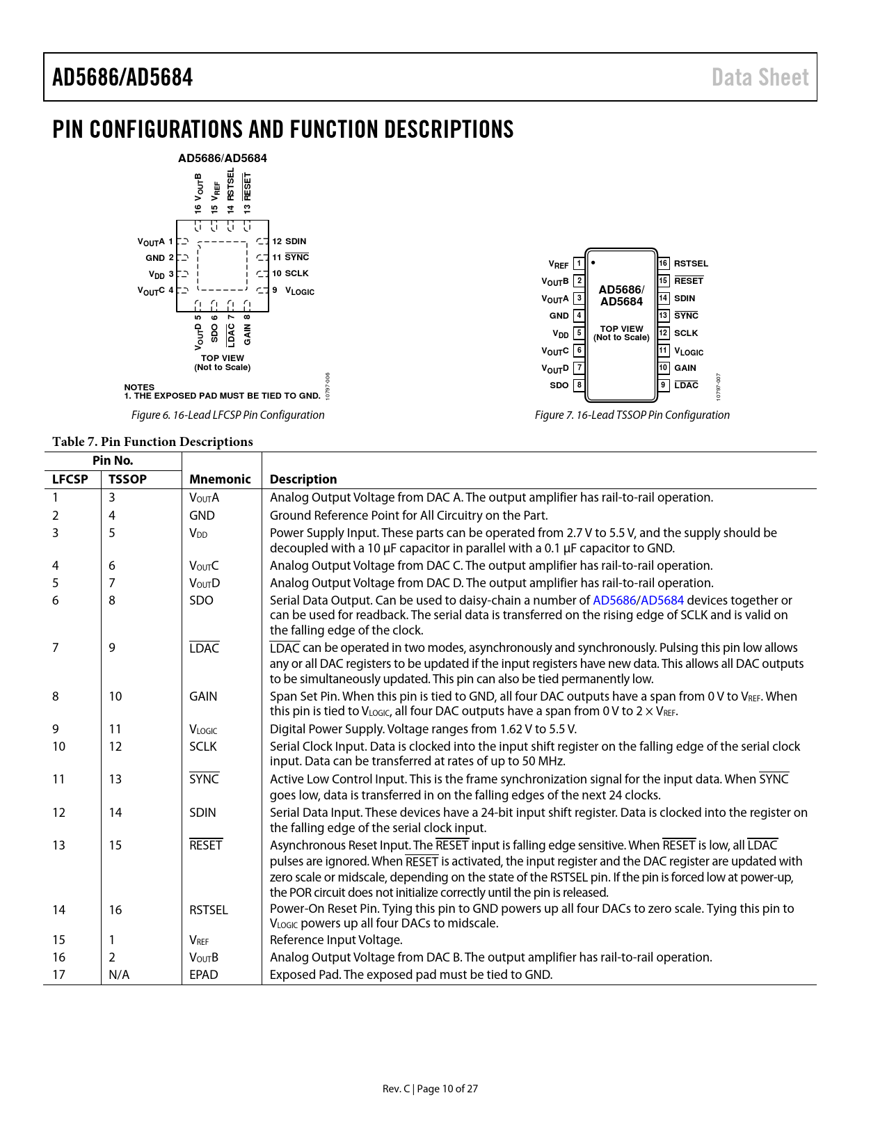 AD5686/AD5684Data SheetPIN CONFIGURATIONS AND FUNCTION DESCRIPTIONSAD5686/AD5684BFSELUT ORESTESETVVRR16151413V112 SDINOUTAGND 211 SYNCV1REF16RSTSELV310 SCLKDDV2OUTB15RESETV49VOUTCLOGICAD5686/V3OUTA14SDINAD56845678GND413SYNCDINTOP VIEWDOV512SCLKUTSDD(Not to Scale)ODACGAVLV6OUTC11VLOGICTOP VIEW(Not to Scale)V7OUTD10GAIN 006 007 NOTESSDO89LDAC1. THE EXPOSED PAD MUST BE TIED TO GND. 10797- 10797- Figure 6. 16-Lead LFCSP Pin Configuration Figure 7. 16-Lead TSSOP Pin Configuration Table 7. Pin Function DescriptionsPin No.LFCSPTSSOPMnemonicDescription 1 3 VOUTA Analog Output Voltage from DAC A. The output amplifier has rail-to-rail operation. 2 4 GND Ground Reference Point for All Circuitry on the Part. 3 5 VDD Power Supply Input. These parts can be operated from 2.7 V to 5.5 V, and the supply should be decoupled with a 10 µF capacitor in parallel with a 0.1 µF capacitor to GND. 4 6 VOUTC Analog Output Voltage from DAC C. The output amplifier has rail-to-rail operation. 5 7 VOUTD Analog Output Voltage from DAC D. The output amplifier has rail-to-rail operation. 6 8 SDO Serial Data Output. Can be used to daisy-chain a number of AD5686/AD5684 devices together or can be used for readback. The serial data is transferred on the rising edge of SCLK and is valid on the falling edge of the clock. 7 9 LDAC LDAC can be operated in two modes, asynchronously and synchronously. Pulsing this pin low allows any or all DAC registers to be updated if the input registers have new data. This allows all DAC outputs to be simultaneously updated. This pin can also be tied permanently low. 8 10 GAIN Span Set Pin. When this pin is tied to GND, all four DAC outputs have a span from 0 V to VREF. When this pin is tied to VLOGIC, all four DAC outputs have a span from 0 V to 2 × VREF. 9 11 VLOGIC Digital Power Supply. Voltage ranges from 1.62 V to 5.5 V. 10 12 SCLK Serial Clock Input. Data is clocked into the input shift register on the falling edge of the serial clock input. Data can be transferred at rates of up to 50 MHz. 11 13 SYNC Active Low Control Input. This is the frame synchronization signal for the input data. When SYNC goes low, data is transferred in on the falling edges of the next 24 clocks. 12 14 SDIN Serial Data Input. These devices have a 24-bit input shift register. Data is clocked into the register on the falling edge of the serial clock input. 13 15 RESET Asynchronous Reset Input. The RESET input is falling edge sensitive. When RESET is low, all LDAC pulses are ignored. When RESET is activated, the input register and the DAC register are updated with zero scale or midscale, depending on the state of the RSTSEL pin. If the pin is forced low at power-up, the POR circuit does not initialize correctly until the pin is released. 14 16 RSTSEL Power-On Reset Pin. Tying this pin to GND powers up all four DACs to zero scale. Tying this pin to VLOGIC powers up all four DACs to midscale. 15 1 VREF Reference Input Voltage. 16 2 VOUTB Analog Output Voltage from DAC B. The output amplifier has rail-to-rail operation. 17 N/A EPAD Exposed Pad. The exposed pad must be tied to GND. Rev. C | Page 10 of 27 Document Outline FEATURES APPLICATIONS FUNCTIONAL BLOCK DIAGRAM GENERAL DESCRIPTION PRODUCT HIGHLIGHTS TABLE OF CONTENTS REVISION HISTORY SPECIFICATIONS AC CHARACTERISTICS TIMING CHARACTERISTICS DAISY-CHAIN AND READBACK TIMING CHARACTERISTICS Circuit and Timing Diagrams ABSOLUTE MAXIMUM RATINGS ESD CAUTION PIN CONFIGURATIONS AND FUNCTION DESCRIPTIONS TYPICAL PERFORMANCE CHARACTERISTICS TERMINOLOGY THEORY OF OPERATION DIGITAL-TO-ANALOG CONVERTER TRANSFER FUNCTION DAC ARCHITECTURE Output Amplifiers SERIAL INTERFACE Input Shift Register STANDALONE OPERATION WRITE AND UPDATE COMMANDS Write to Input Register n (Dependent on LDACB) Update DAC Register n with Contents of Input Register n Write to and Update DAC Channel n (Independent of LDACB) DAISY-CHAIN OPERATION READBACK OPERATION POWER-DOWN OPERATION LOAD DAC (HARDWARE LDACB PIN) Instantaneous DAC Updating (LDACB Held Low) Deferred DAC Updating (LDACB Is Pulsed Low) LDACB MASK REGISTER HARDWARE RESET (RESETB) RESET SELECT PIN (RSTSEL) APPLICATIONS INFORMATION MICROPROCESSOR INTERFACING AD5686/AD5684 TO ADSP-BF531 INTERFACE AD5686/AD5684 TO SPORT INTERFACE LAYOUT GUIDELINES GALVANICALLY ISOLATED INTERFACE OUTLINE DIMENSIONS ORDERING GUIDE