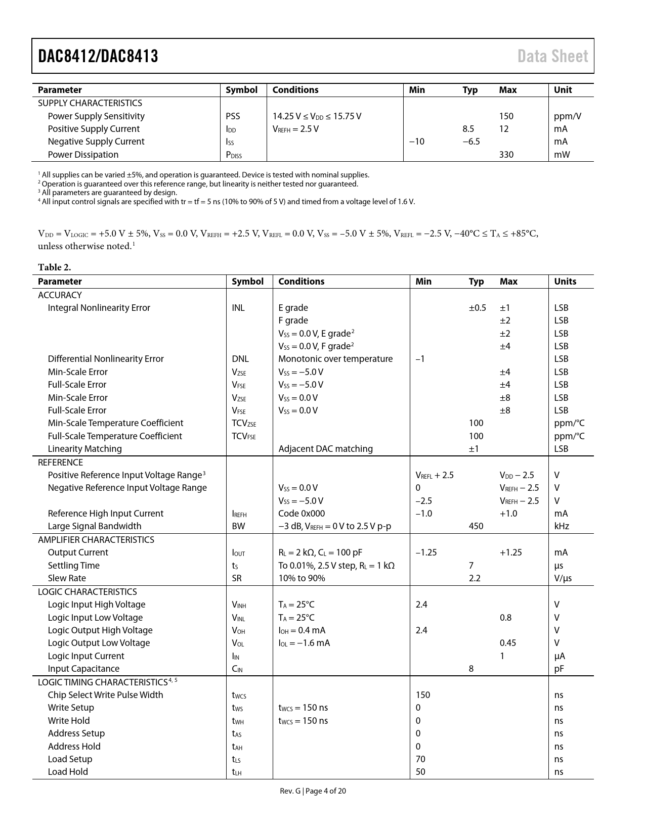 Pages / Page20 / 4 — DAC8412/DAC8413. Data Sheet. Parameter. Symbol. Conditions. Min. Typ. …