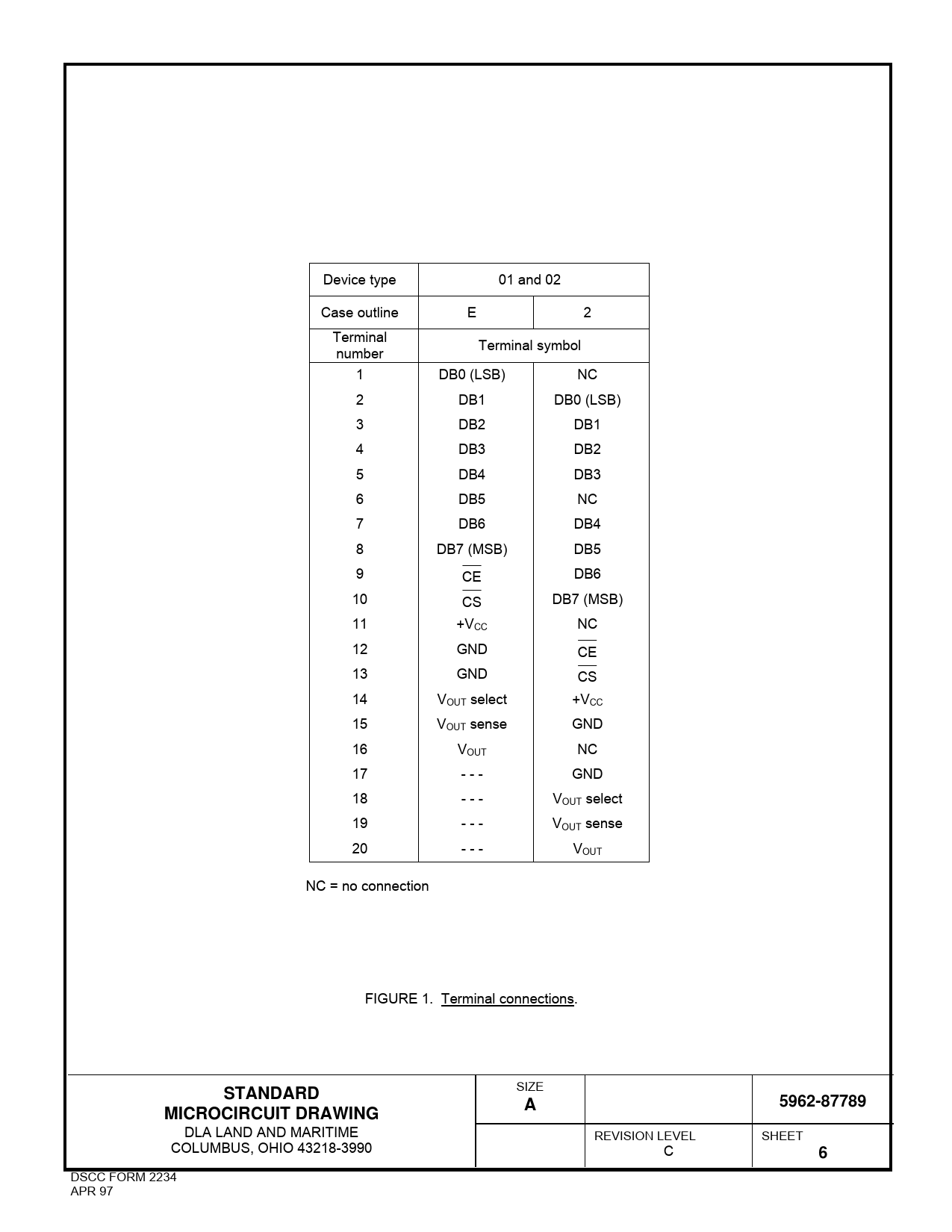 Device type 01 and 02 Case outline E 2 Terminal Terminal symbol number 1 DB0 (LSB) NC 2 DB1 DB0 (LSB) 3 DB2 DB1 4 DB3 DB2 5 DB4 DB3 6 DB5 NC 7 DB6 DB4 8 DB7 (MSB) DB5 9 CE DB6 10 CS DB7 (MSB) 11 +VCC NC 12 GND CE 13 GND CS 14 VOUT select +VCC 15 VOUT sense GND 16 VOUT NC 17 - - - GND 18 - - - VOUT select 19 - - - VOUT sense 20 - - - VOUT NC = no connection FIGURE 1. Terminal connections. SIZE