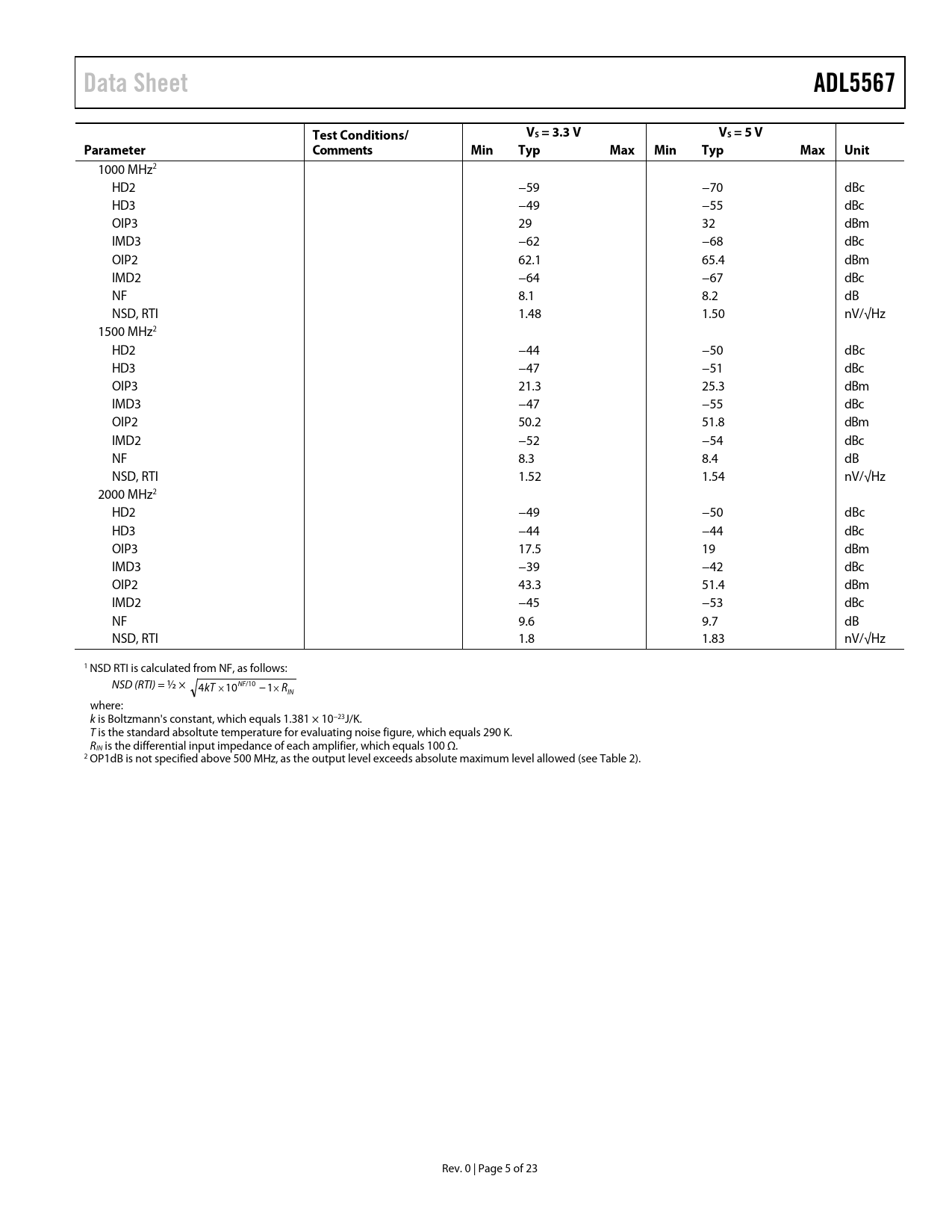 link to page 8 link to page 7 link to page 7 link to page 7 Data SheetADL5567Test Conditions/VS = 3.3 VVS = 5 VParameterCommentsMinTypMaxMinTypMaxUnit 1000 MHz2 HD2 −59 −70 dBc HD3 −49 −55 dBc OIP3 29 32 dBm IMD3 −62 −68 dBc OIP2 62.1 65.4 dBm IMD2 −64 −67 dBc NF 8.1 8.2 dB NSD, RTI 1.48 1.50 nV/√Hz 1500 MHz2 HD2 −44 −50 dBc HD3 −47 −51 dBc OIP3 21.3 25.3 dBm IMD3 −47 −55 dBc OIP2 50.2 51.8 dBm IMD2 −52 −54 dBc NF 8.3 8.4 dB NSD, RTI 1.52 1.54 nV/√Hz 2000 MHz2 HD2 −49 −50 dBc HD3 −44 −44 dBc OIP3 17.5 19 dBm IMD3 −39 −42 dBc OIP2 43.3 51.4 dBm IMD2 −45 −53 dBc NF 9.6 9.7 dB NSD, RTI 1.8 1.83 nV/√Hz 1 NSD RTI is calculated from NF, as follows: NSD (RTI) = ½ × NF 4kT ×10 /10 − 1× R IN where: k is Boltzmann's constant, which equals 1.381 × 10−23J/K. T is the standard absoltute temperature for evaluating noise figure, which equals 290 K. RIN is the differential input impedance of each amplifier, which equals 100 Ω. 2 OP1dB is not specified above 500 MHz, as the output level exceeds absolute maximum level allowed (see Table 2). Rev. 0 | Page 5 of 23 Document Outline FEATURES APPLICATIONS FUNCTIONAL BLOCK DIAGRAM GENERAL DESCRIPTION REVISION HISTORY SPECIFICATIONS ABSOLUTE MAXIMUM RATINGS THERMAL RESISTANCE ESD CAUTION PIN CONFIGURATION AND FUNCTION DESCRIPTIONS TYPICAL PERFORMANCE CHARACTERISTICS THEORY OF OPERATION APPLICATIONS INFORMATION BASIC CONNECTIONS INPUT AND OUTPUT INTERFACING Single-Ended Input to Differential Output INPUT AND OUTPUT EQUIVALENT CIRCUITS GAIN ADJUSTMENT AND INTERFACING EFFECT OF LOAD CAPACITANCE ADC INTERFACING SOLDERING INFORMATION AND RECOMMENDED LAND PATTERN EVALUATION BOARD OUTLINE DIMENSIONS ORDERING GUIDE