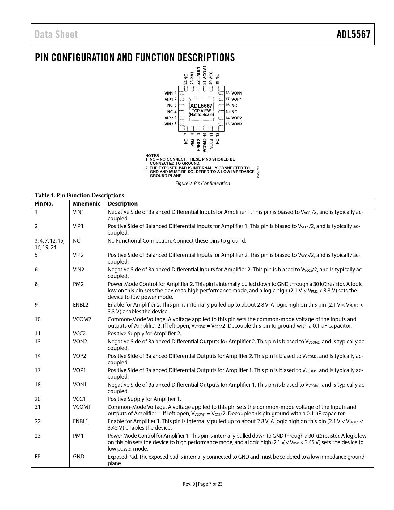 Data Sheet ADL5567 PIN CONFIGURATION AND FUNCTION DESCRIPTIONS 1 1 L M 1 1 B O C NC PM EN VC VC NC 24 23 22 21 20 19 VIN1 1 18 VON1 VIP1 2 17 VOP1 NC 3 16 ADL5567 NC NC 4 TOP VIEW 15 NC (Not to Scale) VIP2 5 14 VOP2 VIN2 6 13 VON2 7 8 9 10 11 12 2 2 2 2 NC M C NC PM NBL O VC E VC NOTES 1. NC = NO CONNECT. THESE PINS SHOULD BE CONNECTED TO GROUND. 2. THE EXPOSED PAD IS INTERNALLY CONNECTED TO