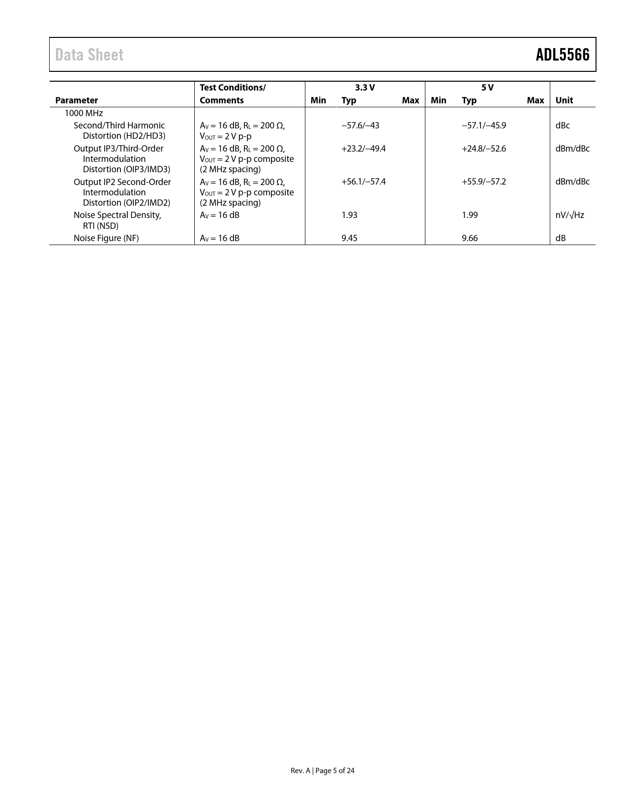Data Sheet. ADL5566. Test Conditions/. 3.3 V. 5 V. Parameter. Comments. Min. Typ. Max Min. Max Unit