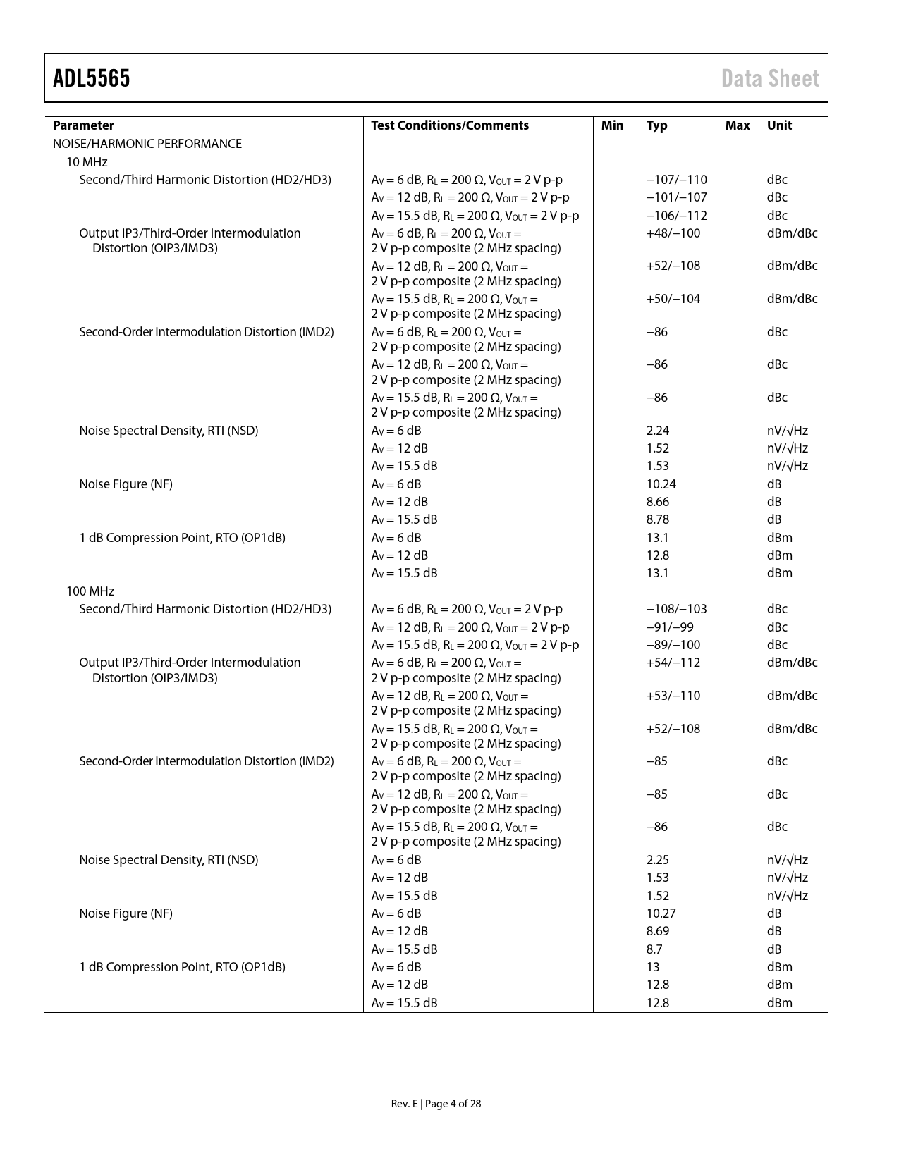 | Pages / Page | 29 / 5 — ADL5565. Data Sheet. Parameter. Test Conditions/Comments. Min. Typ. Max … |