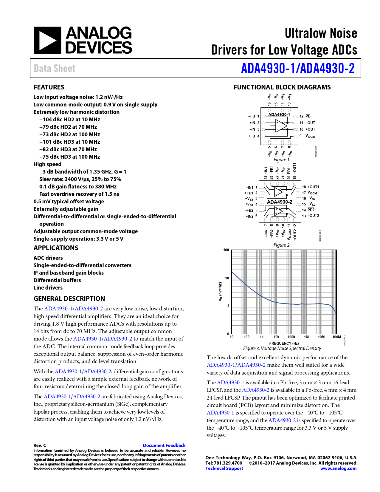 Ultralow Noise. Drivers for Low Voltage ADCs. Data Sheet. ADA4930-1/ADA4930-2. FEATURES. FUNCTIONAL BLOCK DIAGRAMS