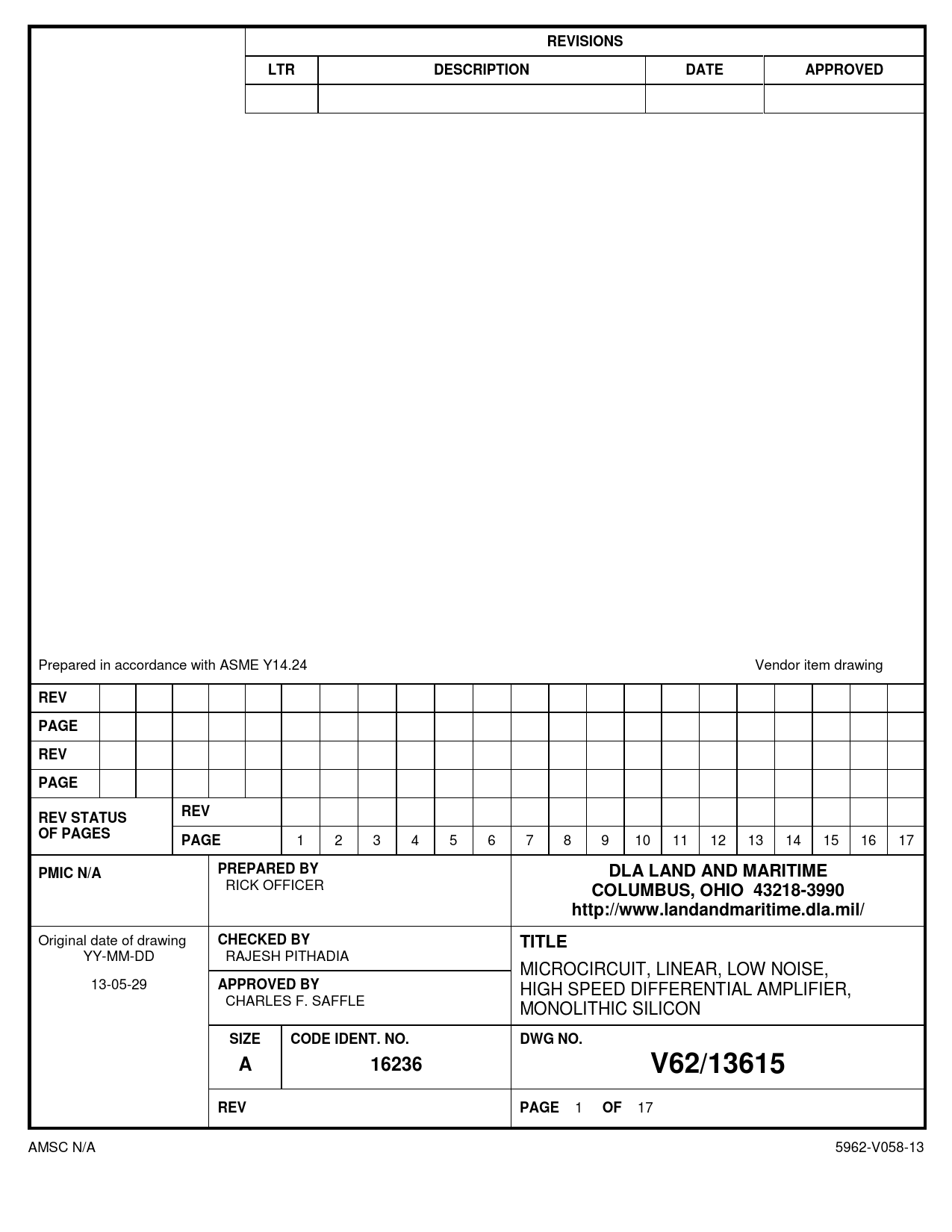 17 AMSC N/A 5962-V058-13 Document Outline DESCRIPTION REV REV PMIC N/A DLA LAND AND MARITIME TITLE SIZE A V62/13615 REV