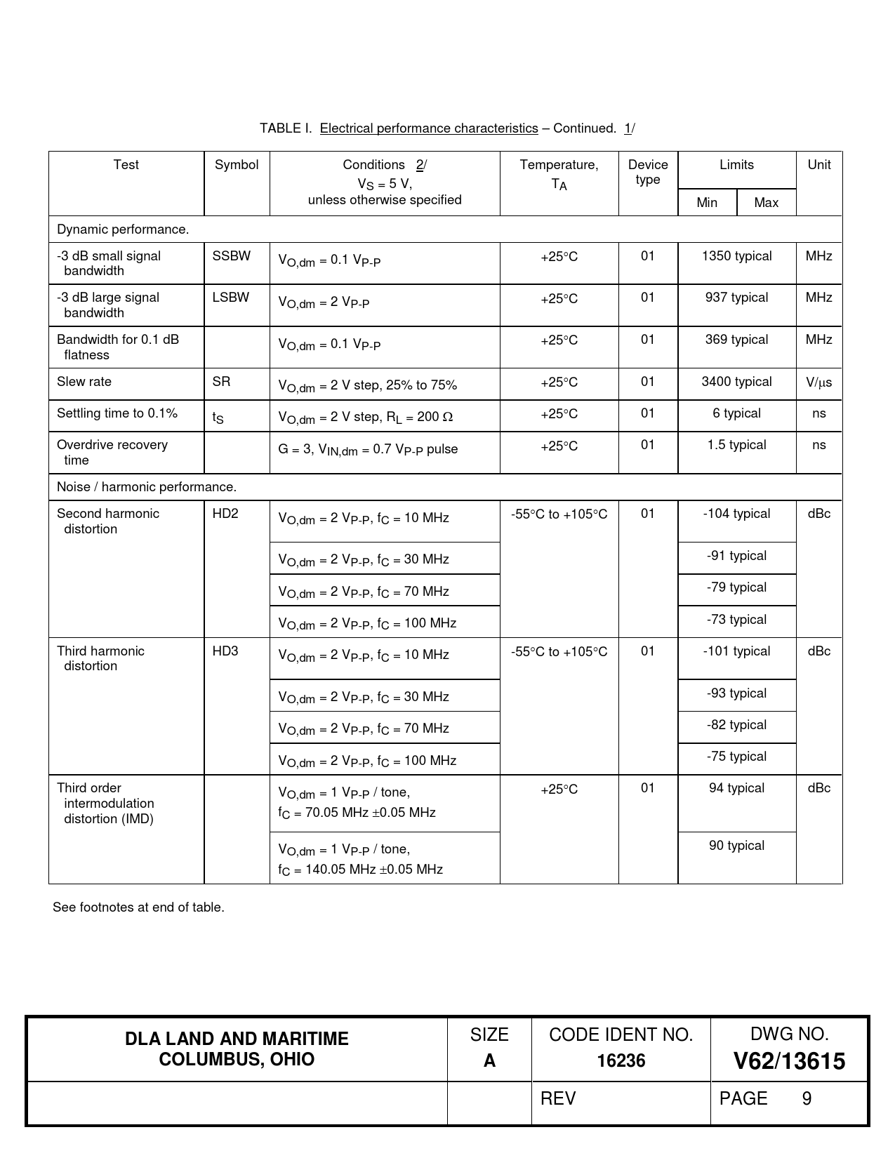 TABLE I. Electrical performance characteristics – Continued. 1/ Test Symbol Conditions 2/ Temperature, Device Limits Unit V type S = 5 V, TA unless otherwise specified Min Max Dynamic performance. -3 dB small signal SSBW VO,dm = 0.1 VP-P +25°C 01 1350 typical MHz bandwidth -3 dB large signal LSBW VO,dm = 2 VP-P +25°C 01 937 typical MHz bandwidth Bandwidth for 0.1 dB VO,dm = 0.1 VP-P +25°C 01 369 typical MHz flatness Slew rate SR VO,dm = 2 V step, 25% to 75% +25°C 01 3400 typical V/µs Settling time to 0.1% tS VO,dm = 2 V step, RL = 200 Ω +25°C 01 6 typical ns Overdrive recovery G = 3, VIN,dm = 0.7 VP-P pulse +25°C 01 1.5 typical ns time Noise / harmonic performance. Second harmonic HD2 VO,dm = 2 VP-P, fC = 10 MHz -55°C to +105°C 01 -104 typical dBc distortion VO,dm = 2 VP-P, fC = 30 MHz -91 typical VO,dm = 2 VP-P, fC = 70 MHz -79 typical VO,dm = 2 VP-P, fC = 100 MHz -73 typical Third harmonic HD3 VO,dm = 2 VP-P, fC = 10 MHz -55°C to +105°C 01 -101 typical dBc distortion VO,dm = 2 VP-P, fC = 30 MHz -93 typical VO,dm = 2 VP-P, fC = 70 MHz -82 typical VO,dm = 2 VP-P, fC = 100 MHz -75 typical Third order V +25°C 01 94 typical dBc O,dm = 1 VP-P / tone, intermodulation f distortion (IMD) C = 70.05 MHz ±0.05 MHz V 90 typical O,dm = 1 VP-P / tone, fC = 140.05 MHz ±0.05 MHz See footnotes at end of table.