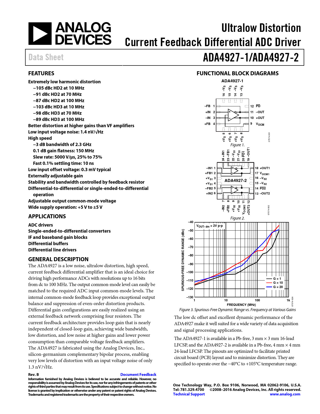 Ultralow Distortion. Current Feedback Differential ADC Driver. Data Sheet. ADA4927-1/ADA4927-2. FEATURES