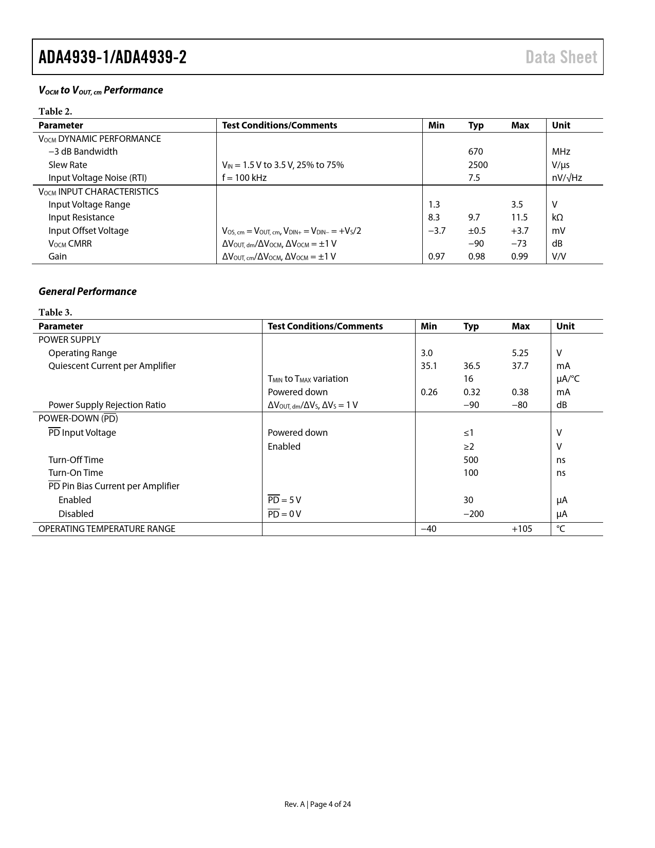 ADA4939-1/ADA4939-2. Data Sheet. VOCM to VOUT, cm Performance. Table 2. Parameter. Test Conditions/Comments. Min. Typ. Max. Unit