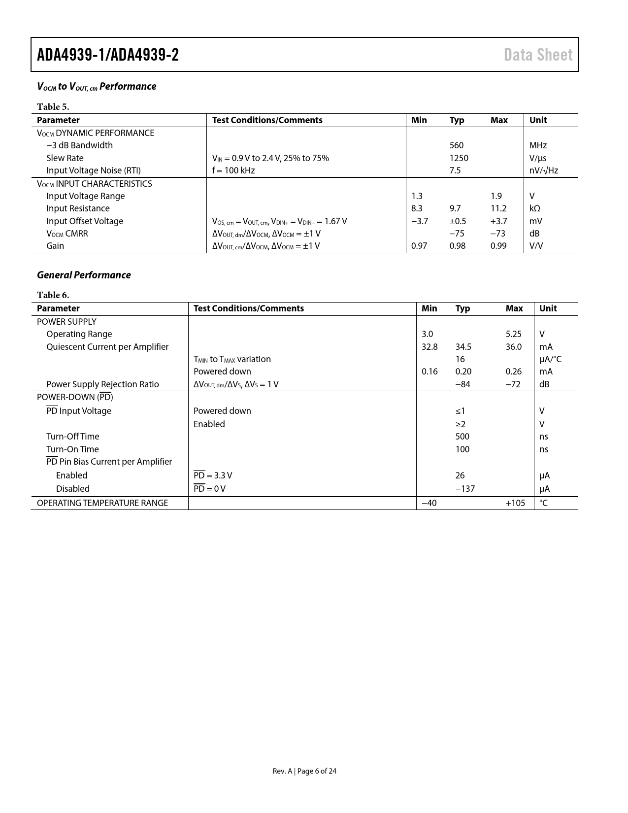 ADA4939-1/ADA4939-2. Data Sheet. VOCM to VOUT, cm Performance. Table 5. Parameter. Test Conditions/Comments. Min. Typ. Max. Unit
