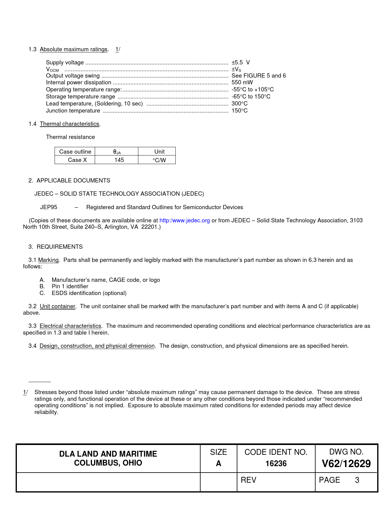 1.3 Absolute maximum ratings. 1/ Supply voltage ... ±5.5 V VOCM .. ±VS Output voltage swing ... See FIGURE 5 and 6 Internal power dissipation .. 550 mW Operating temperature range: .. -55°C to +105°C Storage temperature range ... -65°C to 150°C Lead temperature, (Soldering, 10 sec) ... 300°C Junction temperature .. 150°C 1.4 Thermal characteristics. Thermal resistance Case outline θJA Unit Case X 145 °C/W 2. APPLICABLE DOCUMENTS JEDEC – SOLID STATE TECHNOLOGY ASSOCIATION (JEDEC) JEP95 – Registered and Standard Outlines for Semiconductor Devices (Copies of these documents are available online at http:/www.jedec.org or from JEDEC – Solid State Technology Association, 3103 North 10th Street, Suite 240–S, Arlington, VA 22201.) 3. REQUIREMENTS 3.1 Marking. Parts shall be permanently and legibly marked with the manufacturer’s part number as shown in 6.3 herein and as follows: A. Manufacturer’s name, CAGE code, or logo B. Pin 1 identifier C. ESDS identification (optional) 3.2 Unit container. The unit container shall be marked with the manufacturer’s part number and with items A and C (if applicable) above. 3.3 Electrical characteristics. The maximum and recommended operating conditions and electrical performance characteristics are as specified in 1.3 and table I herein. 3.4 Design, construction, and physical dimension. The design, construction, and physical dimensions are as specified herein. 1/ Stresses beyond those listed under “absolute maximum ratings” may cause permanent damage to the device. These are stress ratings only, and functional operation of the device at these or any other conditions beyond those indicated under “recommended operating conditions” is not implied. Exposure to absolute maximum rated conditions for extended periods may affect device reliability.