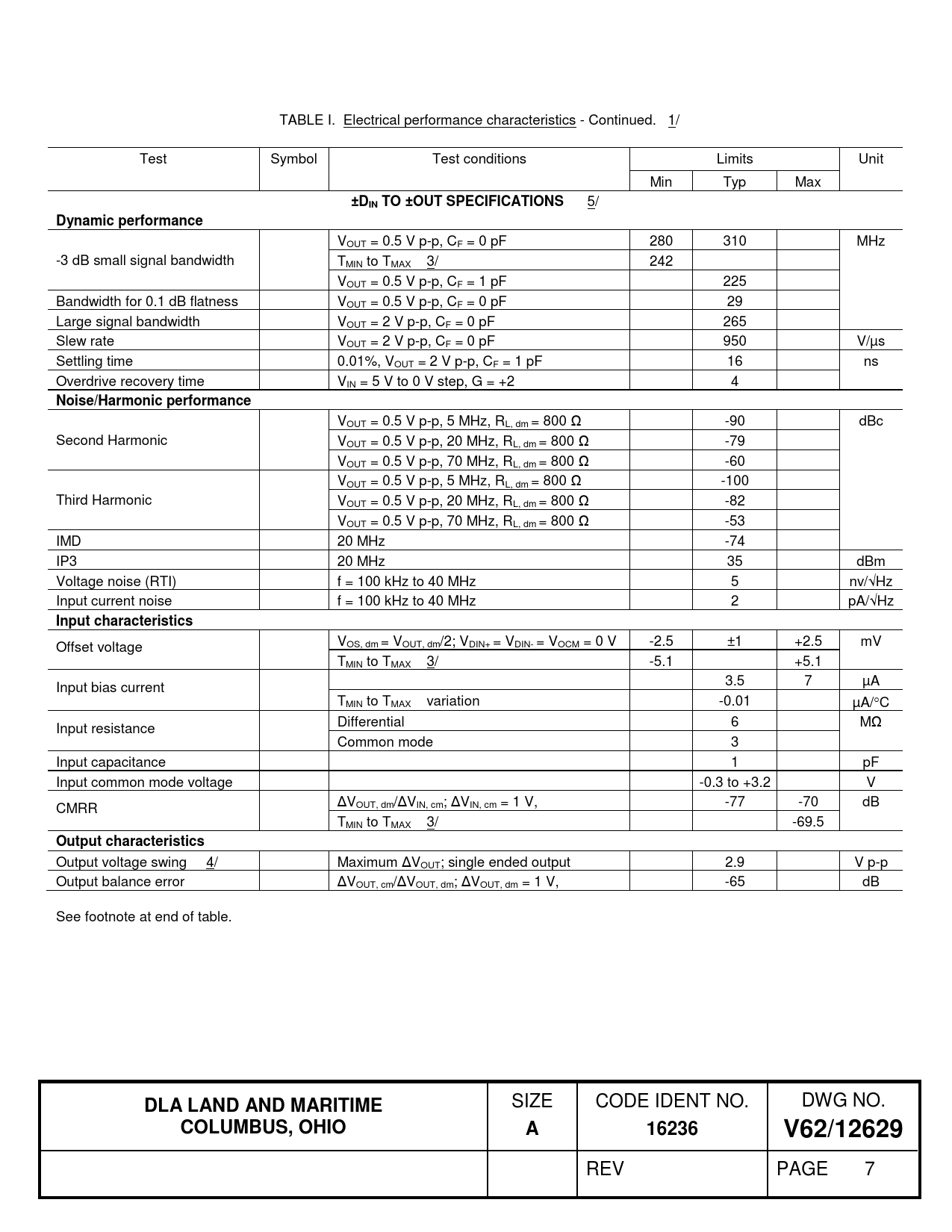 Offset voltage VOS, dm = VOUT, dm/2; VDIN+ = VDIN- = VOCM = 0 V -2.5 ±1 +2.5 mV TMIN to TMAX 3/ -5.1 +5.1 Input bias current 3.5 7 µA TMIN to TMAX variation -0.01 µA/°C Input resistance Differential 6 MΩ Common mode 3 Input capacitance 1 pF Input common mode voltage -0.3 to +3.2 V CMRR ΔVOUT, dm/ΔVIN, cm; ΔVIN, cm = 1 V, -77 -70 dB TMIN to TMAX 3/ -69.5