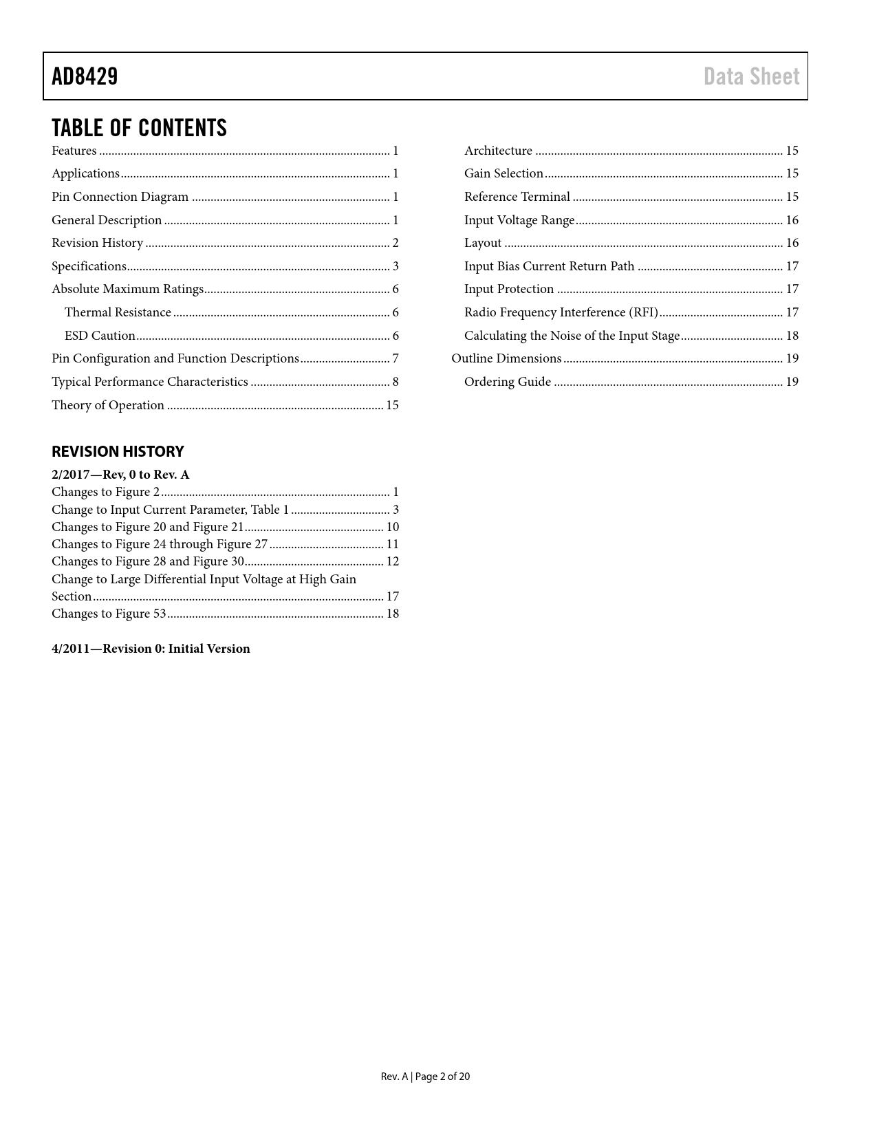 link to page 1 link to page 1 link to page 1 link to page 1 link to page 3 link to page 4 link to page 7 link to page 7 link to page 7 link to page 8 link to page 9 link to page 16 link to page 16 link to page 16 link to page 16 link to page 17 link to page 17 link to page 18 link to page 18 link to page 18 link to page 19 link to page 20 link to page 20 AD8429Data SheetTABLE OF CONTENTS Features .. 1 Architecture .. 15 Applications ... 1 Gain Selection ... 15 Pin Connection Diagram .. 1 Reference Terminal .. 15 General Description ... 1 Input Voltage Range ... 16 Revision History ... 2 Layout .. 16 Specifications ... 3 Input Bias Current Return Path ... 17 Absolute Maximum Ratings .. 6 Input Protection ... 17 Thermal Resistance .. 6 Radio Frequency Interference (RFI) .. 17 ESD Caution .. 6 Calculating the Noise of the Input Stage ... 18 Pin Configuration and Function Descriptions ... 7 Outline Dimensions ... 19 Typical Performance Characteristics ... 8 Ordering Guide .. 19 Theory of Operation .. 15 REVISION HISTORY 2/2017—Rev, 0 to Rev. A Changes to Figure 2 .. 1 Change to Input Current Parameter, Table 1 .. 3 Changes to Figure 20 and Figure 21 ... 10 Changes to Figure 24 through Figure 27 ... 11 Changes to Figure 28 and Figure 30 ... 12 Change to Large Differential Input Voltage at High Gain Section .. 17 Changes to Figure 53 .. 18 4/2011—Revision 0: Initial Version Rev. A | Page 2 of 20 Document Outline FEATURES APPLICATIONS PIN CONNECTION DIAGRAM GENERAL DESCRIPTION REVISION HISTORY SPECIFICATIONS ABSOLUTE MAXIMUM RATINGS THERMAL RESISTANCE ESD CAUTION PIN CONFIGURATION AND FUNCTION DESCRIPTIONS TYPICAL PERFORMANCE CHARACTERISTICS THEORY OF OPERATION ARCHITECTURE RG Power Dissipation REFERENCE TERMINAL INPUT VOLTAGE RANGE LAYOUT Common-Mode Rejection Ratio over Frequency Power Supplies and Grounding Reference Pin INPUT BIAS CURRENT RETURN PATH INPUT PROTECTION Input Voltages Beyond the Rails Large Differential Input Voltage at High Gain IMAX RADIO FREQUENCY INTERFERENCE (RFI) CALCULATING THE NOISE OF THE INPUT STAGE Source Resistance Noise Voltage Noise of the Instrumentation Amplifier Current Noise of the Instrumentation Amplifier Total Noise Density Calculation OUTLINE DIMENSIONS ORDERING GUIDE