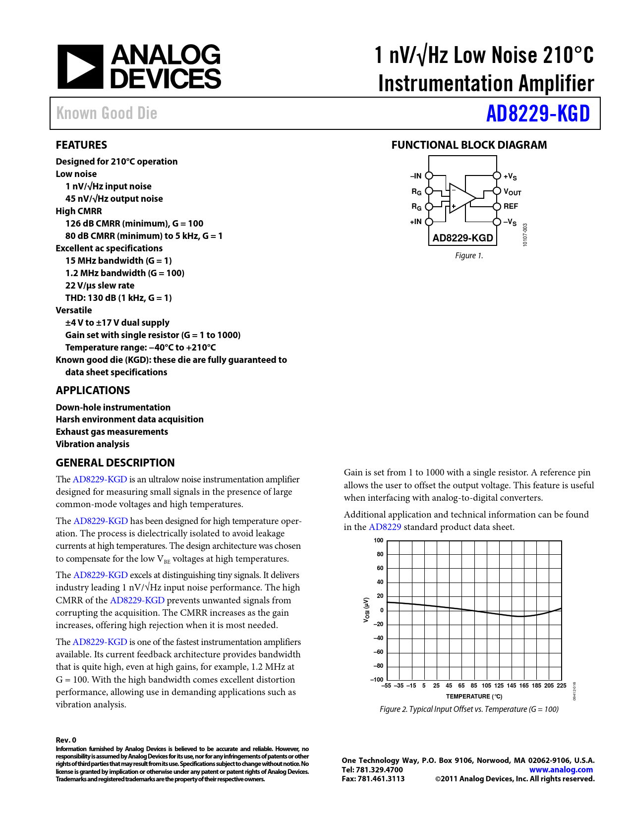 Gain is set from 1 to 1000 with a single resistor. A reference pin The AD8229-KGD is an ultralow noise instrumentation amplifier al ows the user to offset the output voltage. This feature is useful designed for measuring small signals in the presence of large when interfacing with analog-to-digital converters. common-mode voltages and high temperatures. Additional application and technical information can be found The AD8229-KGD has been designed for high temperature oper- in the AD8229 standard product data sheet. ation. The process is dielectrically isolated to avoid leakage currents at high temperatures. The design architecture was chosen