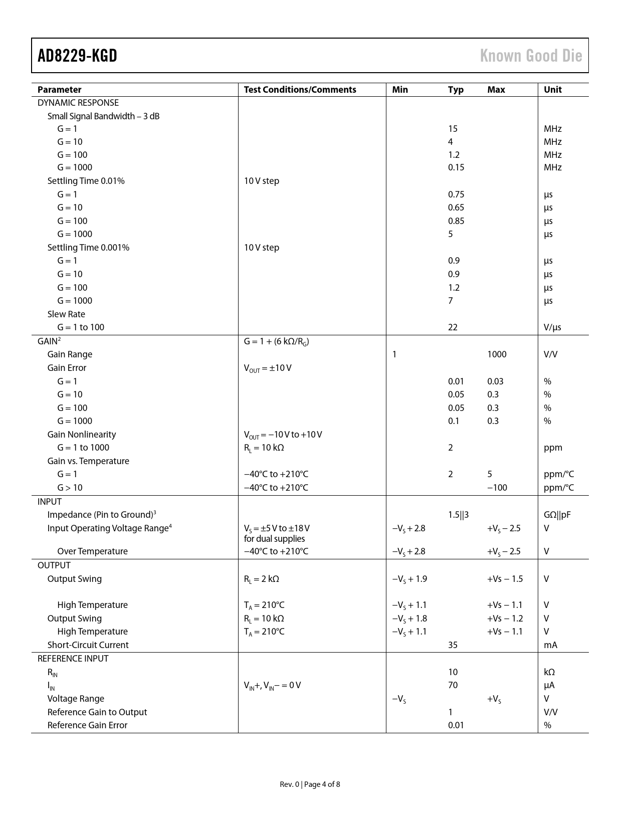 link to page 5 link to page 5 link to page 5 AD8229-KGDKnown Good DieParameterTest Conditions/CommentsMinTypMaxUnit DYNAMIC RESPONSE Small Signal Bandwidth – 3 dB G = 1 15 MHz G = 10 4 MHz G = 100 1.2 MHz G = 1000 0.15 MHz Settling Time 0.01% 10 V step G = 1 0.75 µs G = 10 0.65 µs G = 100 0.85 µs G = 1000 5 µs Settling Time 0.001% 10 V step G = 1 0.9 µs G = 10 0.9 µs G = 100 1.2 µs G = 1000 7 µs Slew Rate G = 1 to 100 22 V/µs GAIN2 G = 1 + (6 kΩ/R ) G Gain Range 1 1000 V/V Gain Error V = ±10 V OUT G = 1 0.01 0.03 % G = 10 0.05 0.3 % G = 100 0.05 0.3 % G = 1000 0.1 0.3 % Gain Nonlinearity V = −10 V to +10 V OUT G = 1 to 1000 R = 10 kΩ 2 ppm L Gain vs. Temperature G = 1 −40°C to +210°C 2 5 ppm/°C G > 10 −40°C to +210°C −100 ppm/°C INPUT Impedance (Pin to Ground)3 1.5||3 GΩ||pF Input Operating Voltage Range4 V = ±5 V to ±18 V −V + 2.8 +V − 2.5 V S S S for dual supplies Over Temperature −40°C to +210°C −V + 2.8 +V − 2.5 V S S OUTPUT Output Swing R = 2 kΩ −V + 1.9 +Vs − 1.5 V L S High Temperature T = 210°C −V + 1.1 +Vs − 1.1 V A S Output Swing R = 10 kΩ −V + 1.8 +Vs − 1.2 V L S High Temperature T = 210°C −V + 1.1 +Vs − 1.1 V A S Short-Circuit Current 35 mA REFERENCE INPUT R 10 kΩ IN I V +, V − = 0 V 70 µA IN IN IN Voltage Range −V +V V S S Reference Gain to Output 1 V/V Reference Gain Error 0.01 % Rev. 0 | Page 4 of 8 Document Outline Features Applications General Description Functional Block Diagram Revision History Specifications Absolute Maximum Ratings ESD Caution Pad Configuration and Function Descriptions Outline Dimensions Die Specifications and Assembly Recommendations Ordering Guide