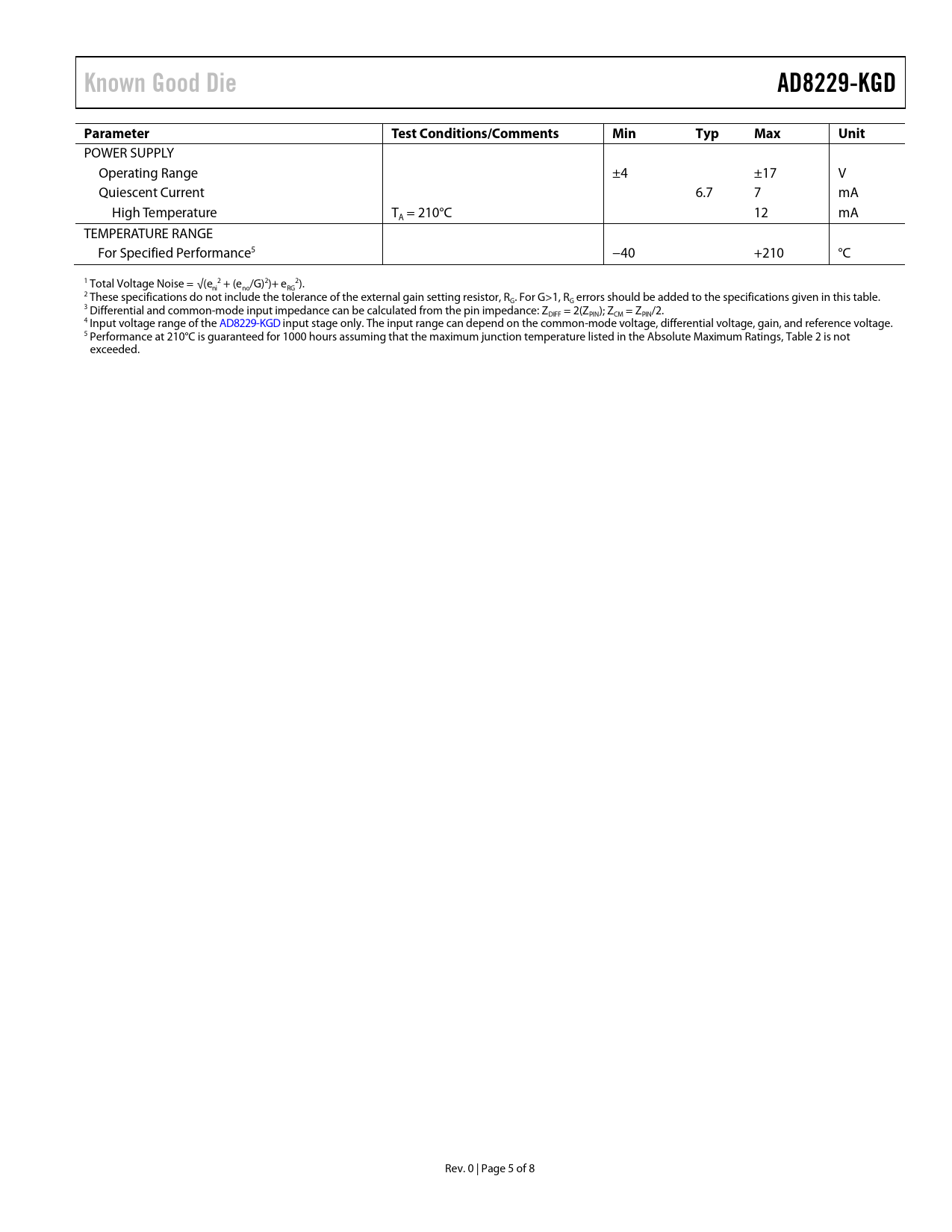 link to page 6 link to page 6 link to page 5 Known Good DieAD8229-KGDParameterTest Conditions/CommentsMinTypMaxUnit POWER SUPPLY Operating Range ±4 ±17 V Quiescent Current 6.7 7 mA High Temperature T = 210°C 12 mA A TEMPERATURE RANGE For Specified Performance5 −40 +210 °C 1 Total Voltage Noise = √(e 2 2 ni + (eno/G)2)+ eRG ). 2 These specifications do not include the tolerance of the external gain setting resistor, RG. For G>1, RG errors should be added to the specifications given in this table. 3 Differential and common-mode input impedance can be calculated from the pin impedance: ZDIFF = 2(ZPIN); ZCM = ZPIN/2. 4 Input voltage range of the AD8229-KGD input stage only. The input range can depend on the common-mode voltage, differential voltage, gain, and reference voltage. 5 Performance at 210°C is guaranteed for 1000 hours assuming that the maximum junction temperature listed in the Absolute Maximum Ratings, Table 2 is not exceeded. Rev. 0 | Page 5 of 8 Document Outline Features Applications General Description Functional Block Diagram Revision History Specifications Absolute Maximum Ratings ESD Caution Pad Configuration and Function Descriptions Outline Dimensions Die Specifications and Assembly Recommendations Ordering Guide