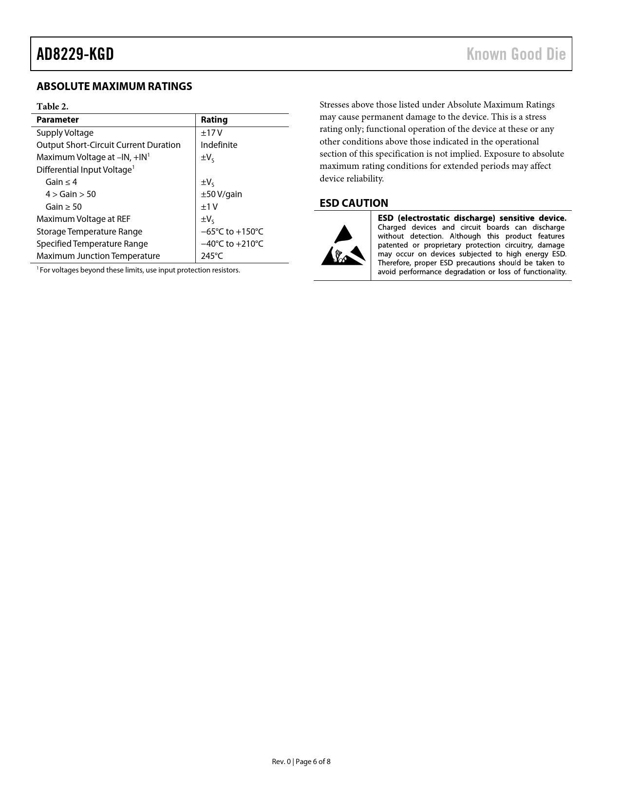 AD8229-KGD Known Good Die ABSOLUTE MAXIMUM RATINGS Table 2 Parameter Rating ESD CAUTION
