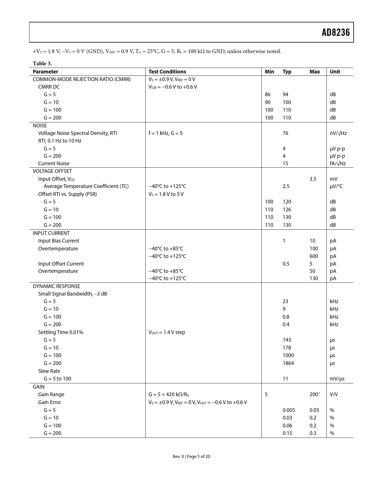 AD8236 Table 3 Parameter Test Conditions Min Typ Max Unit