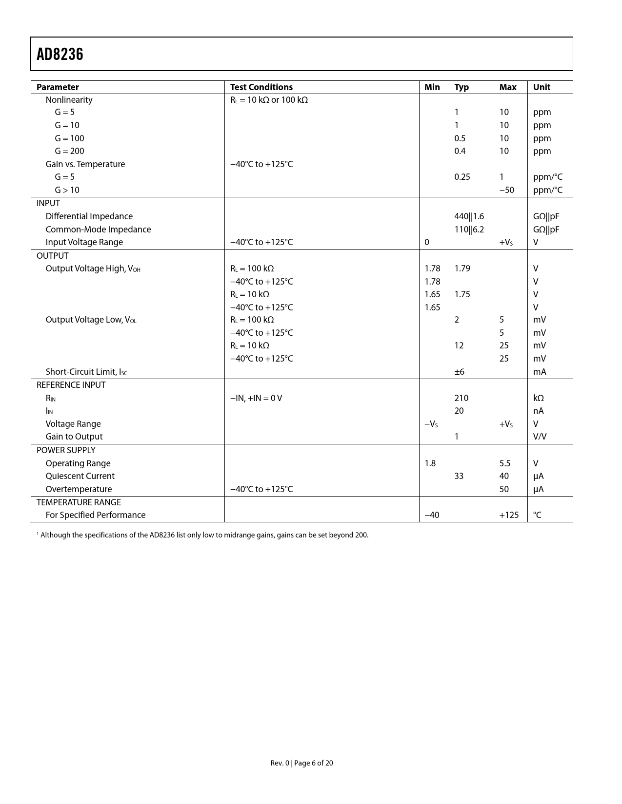 AD8236 Parameter Test Conditions Min Typ Max Unit