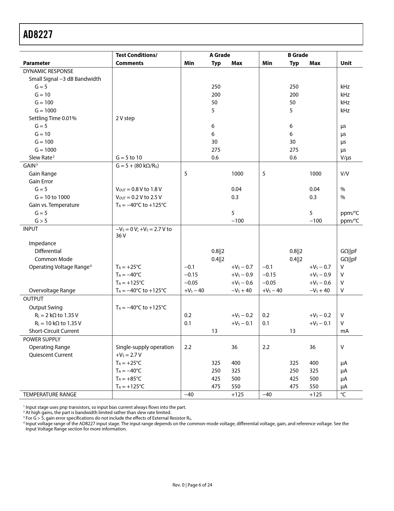 link to page 7 link to page 7 link to page 7 link to page 21 AD8227Test Conditions/A GradeB GradeParameterCommentsMin TypMax Min TypMax Unit DYNAMIC RESPONSE Small Signal −3 dB Bandwidth G = 5 250 250 kHz G = 10 200 200 kHz G = 100 50 50 kHz G = 1000 5 5 kHz Settling Time 0.01% 2 V step G = 5 6 6 μs G = 10 6 6 μs G = 100 30 30 μs G = 1000 275 275 μs Slew Rate2 G = 5 to 10 0.6 0.6 V/μs GAIN3 G = 5 + (80 kΩ/RG) Gain Range 5 1000 5 1000 V/V Gain Error G = 5 VOUT = 0.8 V to 1.8 V 0.04 0.04 % G = 10 to 1000 VOUT = 0.2 V to 2.5 V 0.3 0.3 % Gain vs. Temperature TA = −40°C to +125°C G = 5 5 5 ppm/°C G > 5 −100 −100 ppm/°C INPUT −VS = 0 V; +VS = 2.7 V to 36 V Impedance Differential 0.8||2 0.8||2 GΩ||pF Common Mode 0.4||2 0.4||2 GΩ||pF Operating Voltage Range4 TA = +25°C −0.1 +VS − 0.7 −0.1 +VS − 0.7 V TA = −40°C −0.15 +VS − 0.9 −0.15 +VS − 0.9 V TA = +125°C −0.05 +VS − 0.6 −0.05 +VS − 0.6 V Overvoltage Range TA = −40°C to +125°C +VS − 40 −VS + 40 +VS − 40 −VS + 40 V OUTPUT Output Swing TA = −40°C to +125°C RL = 2 kΩ to 1.35 V 0.2 +VS − 0.2 0.2 +VS − 0.2 V RL = 10 kΩ to 1.35 V 0.1 +VS − 0.1 0.1 +VS − 0.1 V Short-Circuit Current 13 13 mA POWER SUPPLY Operating Range Single-supply operation 2.2 36 2.2 36 V Quiescent Current +VS = 2.7 V TA = +25°C 325 400 325 400 μA TA = −40°C 250 325 250 325 μA TA = +85°C 425 500 425 500 μA TA = +125°C 475 550 475 550 μA TEMPERATURE RANGE −40 +125 −40 +125 °C 1 Input stage uses pnp transistors, so input bias current always flows into the part. 2 At high gains, the part is bandwidth limited rather than slew rate limited. 3 For G > 5, gain error specifications do not include the effects of External Resistor RG. 4 Input voltage range of the AD8227 input stage. The input range depends on the common-mode voltage, differential voltage, gain, and reference voltage. See the Input Volt sectio age Range n for more information. Rev. 0 | Page 6 of 24 Document Outline FEATURES APPLICATIONS PIN CONFIGURATION GENERAL DESCRIPTION TABLE OF CONTENTS REVISION HISTORY SPECIFICATIONS ABSOLUTE MAXIMUM RATINGS THERMAL RESISTANCE ESD CAUTION PIN CONFIGURATION AND FUNCTION DESCRIPTIONS TYPICAL PERFORMANCE CHARACTERISTICS THEORY OF OPERATION ARCHITECTURE GAIN SELECTION REFERENCE TERMINAL INPUT VOLTAGE RANGE LAYOUT Common-Mode Rejection Ratio over Frequency Power Supplies References INPUT BIAS CURRENT RETURN PATH INPUT PROTECTION RADIO FREQUENCY INTERFERENCE (RFI) APPLICATIONS INFORMATION DIFFERENTIAL DRIVE Tips for Best Differential Output Performance PRECISION STRAIN GAGE DRIVING AN ADC OUTLINE DIMENSIONS ORDERING GUIDE