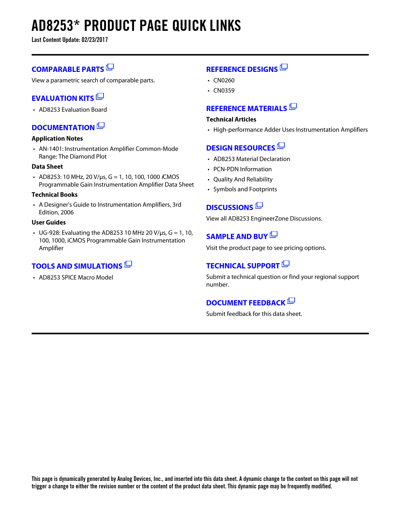 AD8253* PRODUCT PAGE QUICK LINKS Last Content Update: 02/23/2017COMPARABLE PARTSREFERENCE DESIGNS View a parametric search of comparable parts. • CN0260 • CN0359 EVALUATION KITS • AD8253 Evaluation Board REFERENCE MATERIALSTechnical ArticlesDOCUMENTATION • High-performance Adder Uses Instrumentation Amplifiers Application Notes • AN-1401: Instrumentation Amplifier Common-Mode DESIGN RESOURCES Range: The Diamond Plot • AD8253 Material Declaration Data Sheet • PCN-PDN Information • AD8253: 10 MHz, 20 V/μs, G = 1, 10, 100, 1000 iCMOS • Quality And Reliability Programmable Gain Instrumentation Amplifier Data Sheet • Symbols and Footprints Technical Books • A Designer's Guide to Instrumentation Amplifiers, 3rd DISCUSSIONS Edition, 2006 View all AD8253 EngineerZone Discussions. User Guides • UG-928: Evaluating the AD8253 10 MHz 20 V/μs, G = 1, 10, SAMPLE AND BUY 100, 1000, iCMOS Programmable Gain Instrumentation Amplifier Visit the product page to see pricing options. TOOLS AND SIMULATIONSTECHNICAL SUPPORT • AD8253 SPICE Macro Model Submit a technical question or find your regional support number. DOCUMENT FEEDBACK Submit feedback for this data sheet. This page is dynamically generated by Analog Devices, Inc., and inserted into this data sheet. A dynamic change to the content on this page will not trigger a change to either the revision number or the content of the product data sheet. This dynamic page may be frequently modified. Document Outline FEATURES APPLICATIONS GENERAL DESCRIPTION FUNCTIONAL BLOCK DIAGRAM TABLE OF CONTENTS REVISION HISTORY SPECIFICATIONS TIMING DIAGRAM ABSOLUTE MAXIMUM RATINGS MAXIMUM POWER DISSIPATION ESD CAUTION PIN CONFIGURATION AND FUNCTION DESCRIPTIONS TYPICAL PERFORMANCE CHARACTERISTICS THEORY OF OPERATION GAIN SELECTION Transparent Gain Mode Latched Gain Mode Timing for Latched Gain Mode POWER SUPPLY REGULATION AND BYPASSING INPUT BIAS CURRENT RETURN PATH INPUT PROTECTION REFERENCE TERMINAL COMMON-MODE INPUT VOLTAGE RANGE LAYOUT Grounding Coupling Noise Common-Mode Rejection RF INTERFERENCE DRIVING AN ANALOG-TO-DIGITAL CONVERTER APPLICATIONS INFORMATION DIFFERENTIAL OUTPUT SETTING GAINS WITH A MICROCONTROLLER DATA ACQUISITION OUTLINE DIMENSIONS ORDERING GUIDE