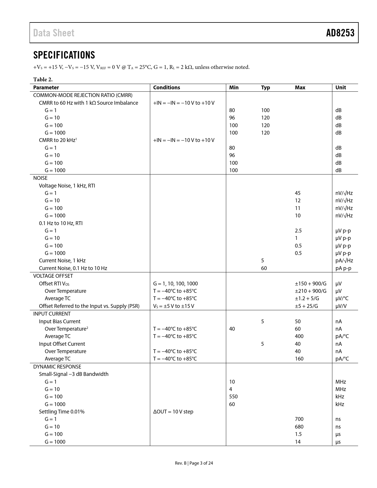 link to page 6 link to page 6 Data SheetAD8253SPECIFICATIONS +VS = +15 V, −VS = −15 V, VREF = 0 V @ TA = 25°C, G = 1, RL = 2 kΩ, unless otherwise noted. Table 2. ParameterConditionsMinTypMaxUnit COMMON-MODE REJECTION RATIO (CMRR) CMRR to 60 Hz with 1 kΩ Source Imbalance +IN = −IN = −10 V to +10 V G = 1 80 100 dB G = 10 96 120 dB G = 100 100 120 dB G = 1000 100 120 dB CMRR to 20 kHz1 +IN = −IN = −10 V to +10 V G = 1 80 dB G = 10 96 dB G = 100 100 dB G = 1000 100 dB NOISE Voltage Noise, 1 kHz, RTI G = 1 45 nV/√Hz G = 10 12 nV/√Hz G = 100 11 nV/√Hz G = 1000 10 nV/√Hz 0.1 Hz to 10 Hz, RTI G = 1 2.5 μV p-p G = 10 1 μV p-p G = 100 0.5 μV p-p G = 1000 0.5 μV p-p Current Noise, 1 kHz 5 pA/√Hz Current Noise, 0.1 Hz to 10 Hz 60 pA p-p VOLTAGE OFFSET Offset RTI VOS G = 1, 10, 100, 1000 ±150 + 900/G μV Over Temperature T = −40°C to +85°C ±210 + 900/G μV Average TC T = −40°C to +85°C ±1.2 + 5/G μV/°C Offset Referred to the Input vs. Supply (PSR) VS = ±5 V to ±15 V ±5 + 25/G μV/V INPUT CURRENT Input Bias Current 5 50 nA Over Temperature2 T = −40°C to +85°C 40 60 nA Average TC T = −40°C to +85°C 400 pA/°C Input Offset Current 5 40 nA Over Temperature T = −40°C to +85°C 40 nA Average TC T = −40°C to +85°C 160 pA/°C DYNAMIC RESPONSE Small-Signal −3 dB Bandwidth G = 1 10 MHz G = 10 4 MHz G = 100 550 kHz G = 1000 60 kHz Settling Time 0.01% ΔOUT = 10 V step G = 1 700 ns G = 10 680 ns G = 100 1.5 μs G = 1000 14 μs Rev. B | Page 3 of 24 Document Outline FEATURES APPLICATIONS GENERAL DESCRIPTION FUNCTIONAL BLOCK DIAGRAM TABLE OF CONTENTS REVISION HISTORY SPECIFICATIONS TIMING DIAGRAM ABSOLUTE MAXIMUM RATINGS MAXIMUM POWER DISSIPATION ESD CAUTION PIN CONFIGURATION AND FUNCTION DESCRIPTIONS TYPICAL PERFORMANCE CHARACTERISTICS THEORY OF OPERATION GAIN SELECTION Transparent Gain Mode Latched Gain Mode Timing for Latched Gain Mode POWER SUPPLY REGULATION AND BYPASSING INPUT BIAS CURRENT RETURN PATH INPUT PROTECTION REFERENCE TERMINAL COMMON-MODE INPUT VOLTAGE RANGE LAYOUT Grounding Coupling Noise Common-Mode Rejection RF INTERFERENCE DRIVING AN ANALOG-TO-DIGITAL CONVERTER APPLICATIONS INFORMATION DIFFERENTIAL OUTPUT SETTING GAINS WITH A MICROCONTROLLER DATA ACQUISITION OUTLINE DIMENSIONS ORDERING GUIDE