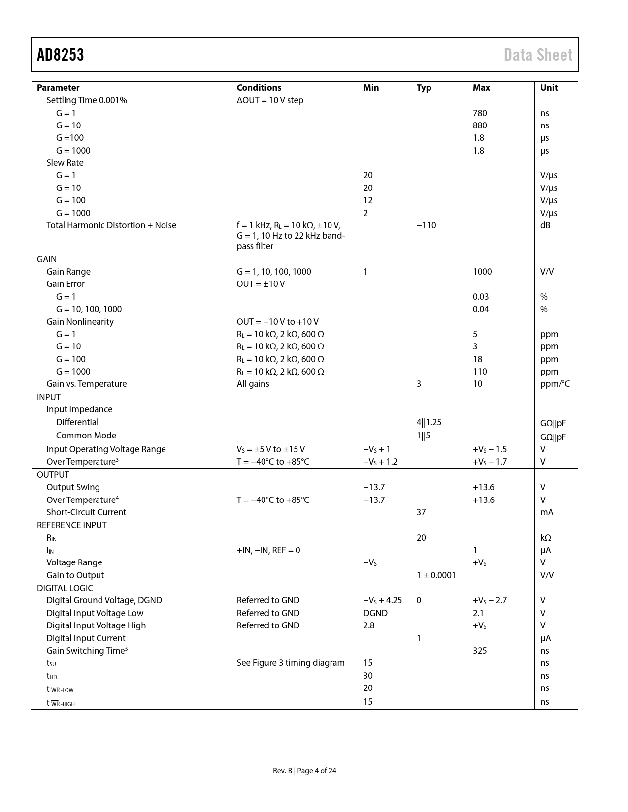 link to page 6 link to page 6 link to page 6 link to page 6 AD8253Data SheetParameterConditionsMinTypMaxUnit Settling Time 0.001% ΔOUT = 10 V step G = 1 780 ns G = 10 880 ns G =100 1.8 μs G = 1000 1.8 μs Slew Rate G = 1 20 V/μs G = 10 20 V/μs G = 100 12 V/μs G = 1000 2 V/μs Total Harmonic Distortion + Noise f = 1 kHz, RL = 10 kΩ, ±10 V, −110 dB G = 1, 10 Hz to 22 kHz band- pass filter GAIN Gain Range G = 1, 10, 100, 1000 1 1000 V/V Gain Error OUT = ±10 V G = 1 0.03 % G = 10, 100, 1000 0.04 % Gain Nonlinearity OUT = −10 V to +10 V G = 1 RL = 10 kΩ, 2 kΩ, 600 Ω 5 ppm G = 10 RL = 10 kΩ, 2 kΩ, 600 Ω 3 ppm G = 100 RL = 10 kΩ, 2 kΩ, 600 Ω 18 ppm G = 1000 RL = 10 kΩ, 2 kΩ, 600 Ω 110 ppm Gain vs. Temperature All gains 3 10 ppm/°C INPUT Input Impedance Differential 4||1.25 GΩpF Common Mode 1||5 GΩpF Input Operating Voltage Range VS = ±5 V to ±15 V −VS + 1 +VS − 1.5 V Over Temperature3 T = −40°C to +85°C −VS + 1.2 +VS − 1.7 V OUTPUT Output Swing −13.7 +13.6 V Over Temperature4 T = −40°C to +85°C −13.7 +13.6 V Short-Circuit Current 37 mA REFERENCE INPUT RIN 20 kΩ IIN +IN, −IN, REF = 0 1 μA Voltage Range −VS +VS V Gain to Output 1 ± 0.0001 V/V DIGITAL LOGIC Digital Ground Voltage, DGND Referred to GND −VS + 4.25 0 +VS − 2.7 V Digital Input Voltage Low Referred to GND DGND 2.1 V Digital Input Voltage High Referred to GND 2.8 +VS V Digital Input Current 1 μA Gain Switching Time5 325 ns tSU See Figure 3 timing diagram 15 ns tHD 30 ns t WR -LOW 20 ns t WR -HIGH 15 ns Rev. B | Page 4 of 24 Document Outline FEATURES APPLICATIONS GENERAL DESCRIPTION FUNCTIONAL BLOCK DIAGRAM TABLE OF CONTENTS REVISION HISTORY SPECIFICATIONS TIMING DIAGRAM ABSOLUTE MAXIMUM RATINGS MAXIMUM POWER DISSIPATION ESD CAUTION PIN CONFIGURATION AND FUNCTION DESCRIPTIONS TYPICAL PERFORMANCE CHARACTERISTICS THEORY OF OPERATION GAIN SELECTION Transparent Gain Mode Latched Gain Mode Timing for Latched Gain Mode POWER SUPPLY REGULATION AND BYPASSING INPUT BIAS CURRENT RETURN PATH INPUT PROTECTION REFERENCE TERMINAL COMMON-MODE INPUT VOLTAGE RANGE LAYOUT Grounding Coupling Noise Common-Mode Rejection RF INTERFERENCE DRIVING AN ANALOG-TO-DIGITAL CONVERTER APPLICATIONS INFORMATION DIFFERENTIAL OUTPUT SETTING GAINS WITH A MICROCONTROLLER DATA ACQUISITION OUTLINE DIMENSIONS ORDERING GUIDE