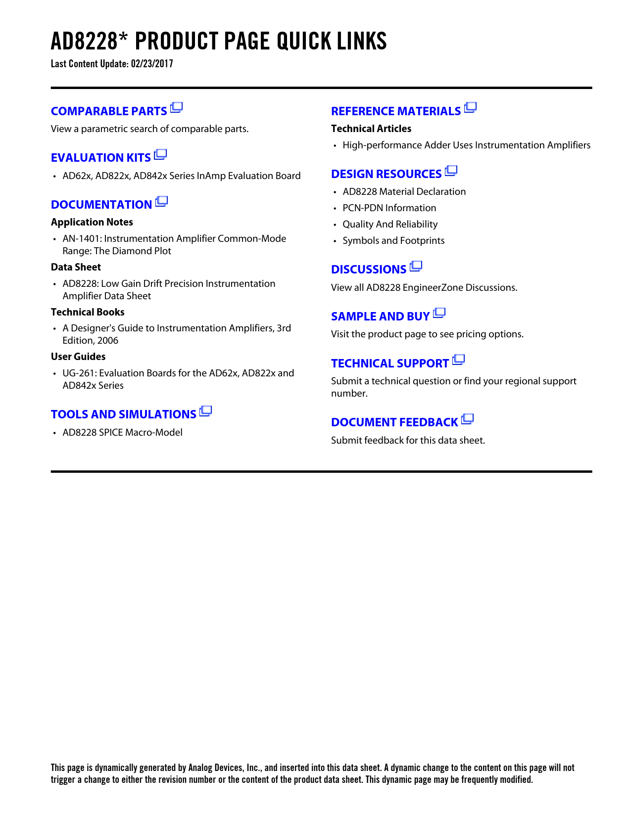 AD8228* PRODUCT PAGE QUICK LINKS Last Content Update: 02/23/2017COMPARABLE PARTSREFERENCE MATERIALS View a parametric search of comparable parts. Technical Articles • High-performance Adder Uses Instrumentation Amplifiers EVALUATION KITS • AD62x, AD822x, AD842x Series InAmp Evaluation Board DESIGN RESOURCES • AD8228 Material Declaration DOCUMENTATION • PCN-PDN Information Application Notes • Quality And Reliability • AN-1401: Instrumentation Amplifier Common-Mode • Symbols and Footprints Range: The Diamond Plot Data SheetDISCUSSIONS • AD8228: Low Gain Drift Precision Instrumentation View all AD8228 EngineerZone Discussions. Amplifier Data Sheet Technical BooksSAMPLE AND BUY • A Designer's Guide to Instrumentation Amplifiers, 3rd Visit the product page to see pricing options. Edition, 2006 User GuidesTECHNICAL SUPPORT • UG-261: Evaluation Boards for the AD62x, AD822x and AD842x Series Submit a technical question or find your regional support number. TOOLS AND SIMULATIONSDOCUMENT FEEDBACK • AD8228 SPICE Macro-Model Submit feedback for this data sheet. This page is dynamically generated by Analog Devices, Inc., and inserted into this data sheet. A dynamic change to the content on this page will not trigger a change to either the revision number or the content of the product data sheet. This dynamic page may be frequently modified. Document Outline FEATURES APPLICATIONS GENERAL DESCRIPTION CONNECTION DIAGRAM TABLE OF CONTENTS REVISION HISTORY SPECIFICATIONS GAIN = 10 GAIN = 100 ABSOLUTE MAXIMUM RATINGS THERMAL RESISTANCE ESD CAUTION PIN CONFIGURATION AND FUNCTION DESCRIPTIONS TYPICAL PERFORMANCE CHARACTERISTICS THEORY OF OPERATION ARCHITECTURE SETTING THE GAIN COMMON-MODE INPUT VOLTAGE RANGE REFERENCE TERMINAL LAYOUT Common-Mode Rejection Ratio over Frequency Power Supplies References Input Bias Current Return Path INPUT PROTECTION Input Voltages Beyond the Rails Large Differential Voltages When G = 100 RADIO FREQUENCY INTERFERENCE (RFI) APPLICATIONS INFORMATION DIFFERENTIAL DRIVE PRECISION STRAIN GAGE DRIVING A DIFFERENTIAL ADC OUTLINE DIMENSIONS ORDERING GUIDE