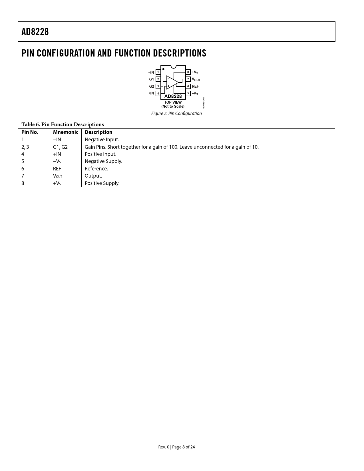 AD8228. PIN CONFIGURATION AND FUNCTION DESCRIPTIONS. –IN 1. 8 +VS. G1 2. 7 VOUT. G2 3. 6 REF. +IN 4. 5 –VS. TOP VIEW. (Not to Scale)