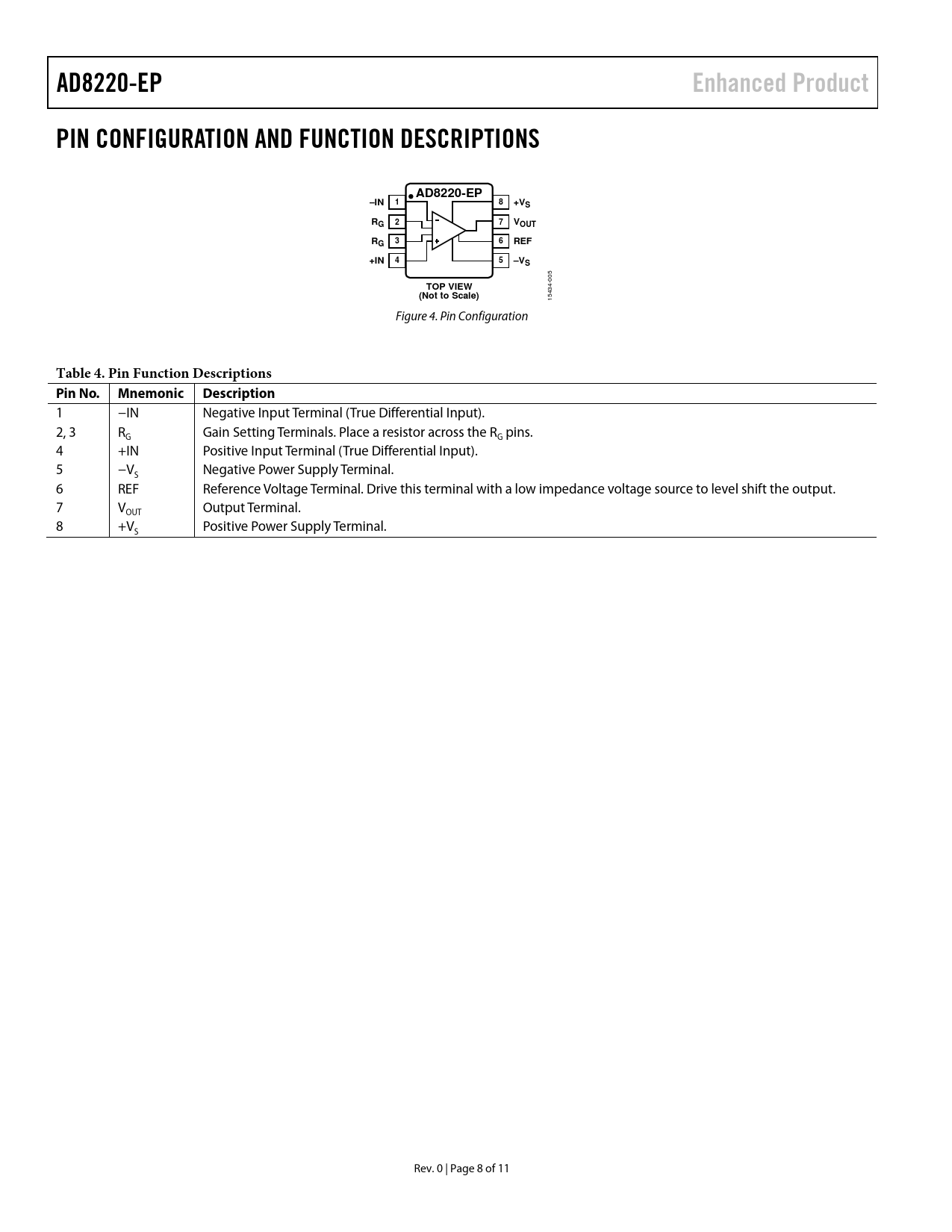AD8220-EPEnhanced ProductPIN CONFIGURATION AND FUNCTION DESCRIPTIONSAD8220-EP–IN18+VSRG27VOUTRG36REF+IN45–VS 005 TOP VIEW(Not to Scale) 15434- Figure 4. Pin Configuration Table 4. Pin Function Descriptions Pin No. Mnemonic Description 1 −IN Negative Input Terminal (True Differential Input). 2, 3 R Gain Setting Terminals. Place a resistor across the R pins. G G 4 +IN Positive Input Terminal (True Differential Input). 5 −V Negative Power Supply Terminal. S 6 REF Reference Voltage Terminal. Drive this terminal with a low impedance voltage source to level shift the output. 7 V Output Terminal. OUT 8 +V Positive Power Supply Terminal. S Rev. 0 | Page 8 of 11 Document Outline FEATURES ENHANCED PRODUCT FEATURES APPLICATIONS GENERAL DESCRIPTION PIN CONFIGURATION TABLE OF CONTENTS REVISION HISTORY SPECIFICATIONS ABSOLUTE MAXIMUM RATINGS ESD CAUTION PIN CONFIGURATION AND FUNCTION DESCRIPTIONS TYPICAL PERFORMANCE CHARACTERISTICS OUTLINE DIMENSIONS ORDERING GUIDE