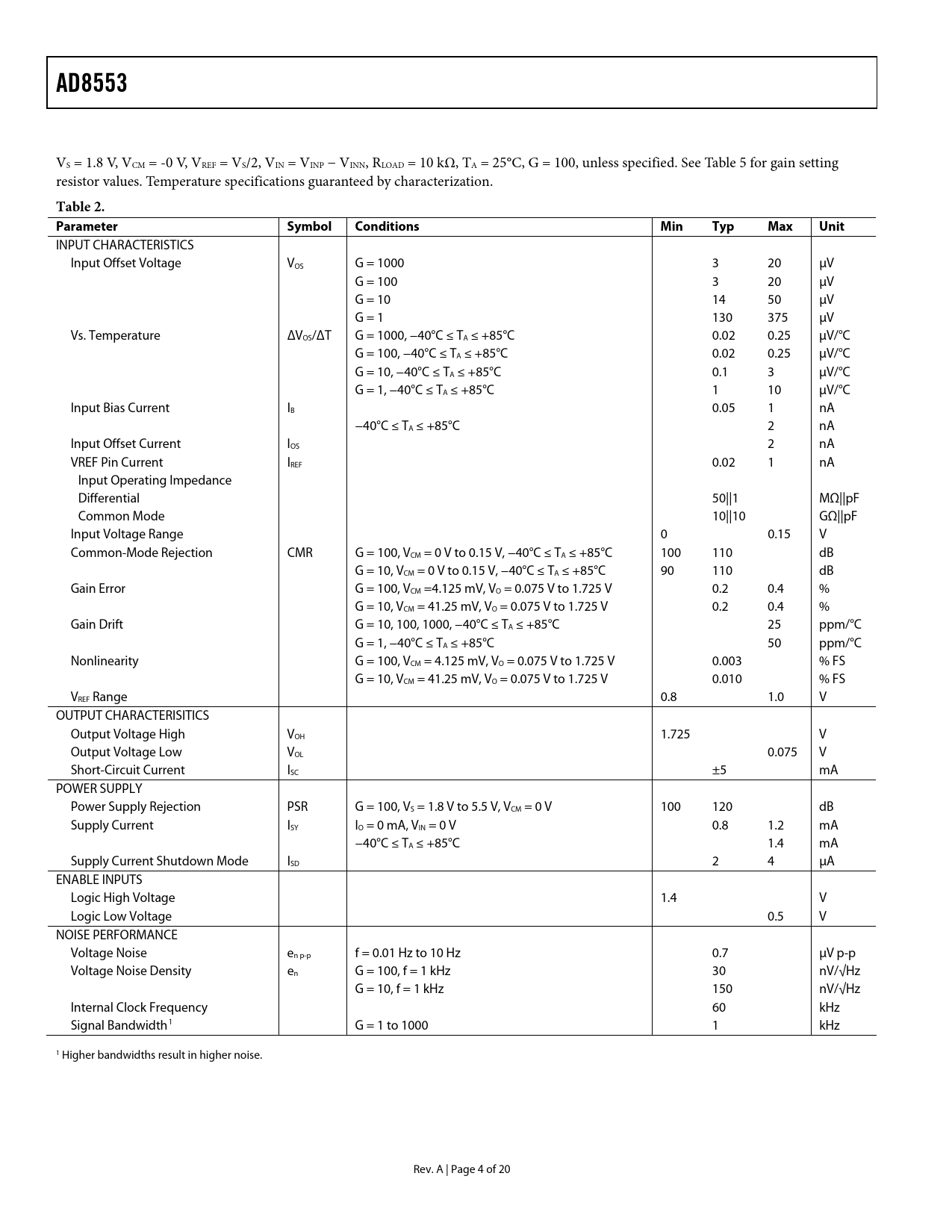 AD8553 Table 2 Parameter Symbol Conditions Min Typ Max Unit