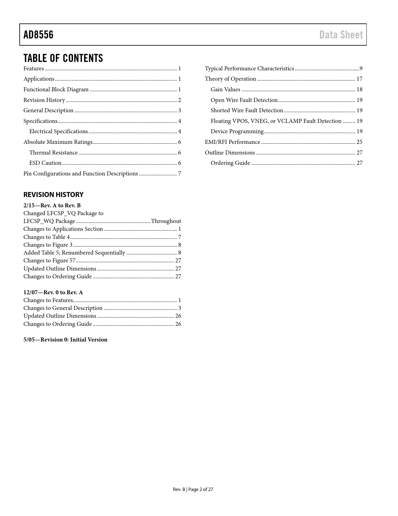 link to page 1 link to page 1 link to page 1 link to page 3 link to page 4 link to page 5 link to page 5 link to page 7 link to page 7 link to page 7 link to page 8 link to page 10 link to page 18 link to page 19 link to page 20 link to page 20 link to page 20 link to page 20 link to page 26 link to page 28 link to page 28 AD8556Data SheetTABLE OF CONTENTS Features .. 1 Typical Performance Characteristics ..9 Applications ... 1 Theory of Operation .. 17 Functional Block Diagram .. 1 Gain Values ... 18 Revision History ... 2 Open Wire Fault Detection ... 19 General Description ... 3 Shorted Wire Fault Detection ... 19 Specifications ... 4 Floating VPOS, VNEG, or VCLAMP Fault Detection ... 19 Electrical Specifications ... 4 Device Programming ... 19 Absolute Maximum Ratings .. 6 EMI/RFI Performance ... 25 Thermal Resistance .. 6 Outline Dimensions ... 27 ESD Caution .. 6 Ordering Guide .. 27 Pin Configurations and Function Descriptions ... 7 REVISION HISTORY 2/15—Rev. A to Rev. B Changed LFCSP_VQ Package to LFCSP_WQ Package ... Throughout Changes to Applications Section .. 1 Changes to Table 4 .. 7 Changes to Figure 3 .. 8 Added Table 5; Renumbered Sequential y .. 8 Changes to Figure 57 .. 27 Updated Outline Dimensions ... 27 Changes to Ordering Guide .. 27 12/07—Rev. 0 to Rev. A Changes to Features .. 1 Changes to General Description .. 3 Updated Outline Dimensions ... 26 Changes to Ordering Guide .. 26 5/05—Revision 0: Initial Version Rev. B | Page 2 of 27 Document Outline FEATURES APPLICATIONS FUNCTIONAL BLOCK DIAGRAM TABLE OF CONTENTS REVISION HISTORY GENERAL DESCRIPTION SPECIFICATIONS ELECTRICAL SPECIFICATIONS ABSOLUTE MAXIMUM RATINGS THERMAL RESISTANCE ESD CAUTION PIN CONFIGURATIONS AND FUNCTION DESCRIPTIONS TYPICAL PERFORMANCE CHARACTERISTICS THEORY OF OPERATION GAIN VALUES OPEN WIRE FAULT DETECTION SHORTED WIRE FAULT DETECTION FLOATING VPOS, VNEG, OR VCLAMP FAULT DETECTION DEVICE PROGRAMMING Digital Interface Initial State Simulation Mode Programming Mode Parity Error Detection Read Mode Sense Current Programming Procedure Determining Optimal Gain and Offset Codes EMI/RFI PERFORMANCE OUTLINE DIMENSIONS ORDERING GUIDE