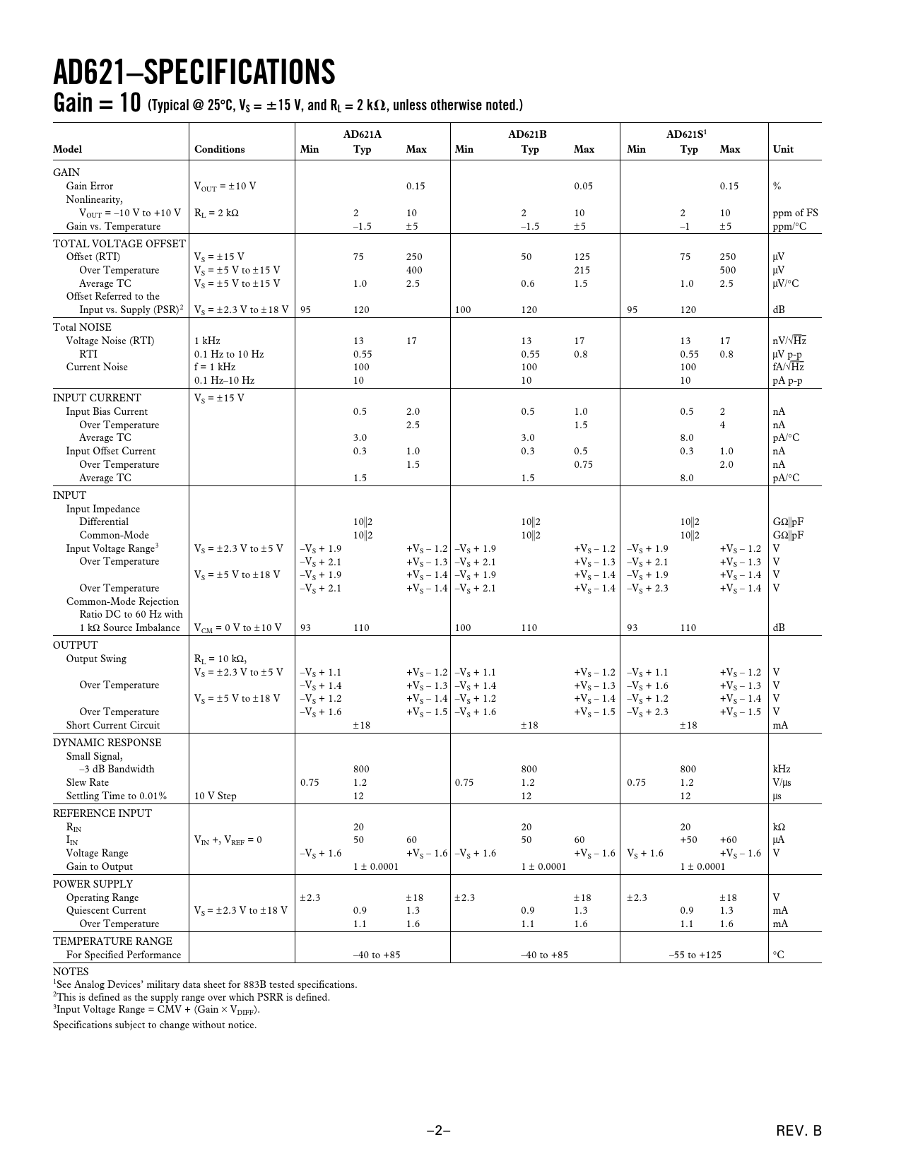 AD621–SPECIFICATIONS Gain = 10 (Typical @ 25. C, VS =. 15 V, and RL = 2 k. , unless otherwise noted.). AD621A. AD621B. AD621S1. Model