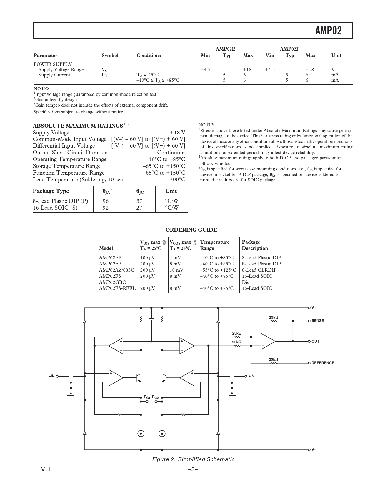 AMP02AMP02EAMP02FParameterSymbolConditionsMinTypMaxMinTypMaxUnit POWER SUPPLY Supply Voltage Range V ± S 4.5 ±18 ±4.5 ±18 V Supply Current ISY TA = 25°C 5 6 5 6 mA –40°C ≤ TA ≤ +85°C 5 6 5 6 mA NOTES 1Input voltage range guaranteed by common-mode rejection test. 2Guaranteed by design. 3Gain tempco does not include the effects of external component drift. Specifications subject to change without notice. ABSOLUTE MAXIMUM RATINGS1, 2 NOTES 1 Supply Voltage ±18 V Stresses above those listed under Absolute Maximum Ratings may cause perma- nent damage to the device. This is a stress rating only; functional operation of the Common-Mode Input Voltage [(V–) – 60 V] to [(V+) + 60 V] device at these or any other conditions above those listed in the operational sections Differential Input Voltage [(V–) – 60 V] to [(V+) + 60 V] of this specifications is not implied. Exposure to absolute maximum rating Output Short-Circuit Duration Continuous conditions for extended periods may affect device reliability. 2 Operating Temperature Range –40°C to +85°C Absolute maximum ratings apply to both DICE and packaged parts, unless otherwise noted. Storage Temperature Range –65°C to +150°C 3θJA is specified for worst case mounting conditions, i.e., θJA is specified for Function Temperature Range –65°C to +150°C device in socket for P-DIP package; θJA is specified for device soldered to Lead Temperature (Soldering, 10 sec) 300°C printed circuit board for SOIC package. Package Type 3 JAJCUnit 8-Lead Plastic DIP (P) 96 37 °C/W 16-Lead SOIC (S) 92 27 °C/W ORDERING GUIDEVIOS max @ VOOS max @ TemperaturePackageModelTA = 25 ⴗ CTA = 25 ⴗ CRangeDescription AMP02EP 100 µV 4 mV –40°C to +85°C 8-Lead Plastic DIP AMP02FP 200 µV 8 mV –40°C to +85°C 8-Lead Plastic DIP AMP02AZ/883C 200 µV 10 mV –55°C to +125°C 8-Lead CERDIP AMP02FS 200 µV 8 mV –40°C to +85°C 16-Lead SOIC AMP02GBC Die AMP02FS-REEL 200 µV 8 mV –40°C to +85°C 16-Lead SOIC V+25k ⍀ SENSE25k ⍀ 25k ⍀ OUT25k ⍀ REFERENCE–IN+INRG1 RG2V– Figure 2. Simplified Schematic REV. E –3– Document Outline FEATURES APPLICATIONS FUNCTIONAL BLOCK DIAGRAM GENERAL DESCRIPTION SPECIFICATIONS ELECTRICAL CHARACTERISTICS ABSOLUTE MAXIMUM RATINGS ORDERING GUIDE WAFER TEST LIMITS Typical Performance Characteristics APPLICATIONS INFORMATION Input and Output Offset Voltages Input Bias and Offset Currents Gain Common-Mode Rejection Grounding Sense and Reference Terminals Overvoltage Protection Power Supply Considerations OUTLINE DIMENSIONS Revision History