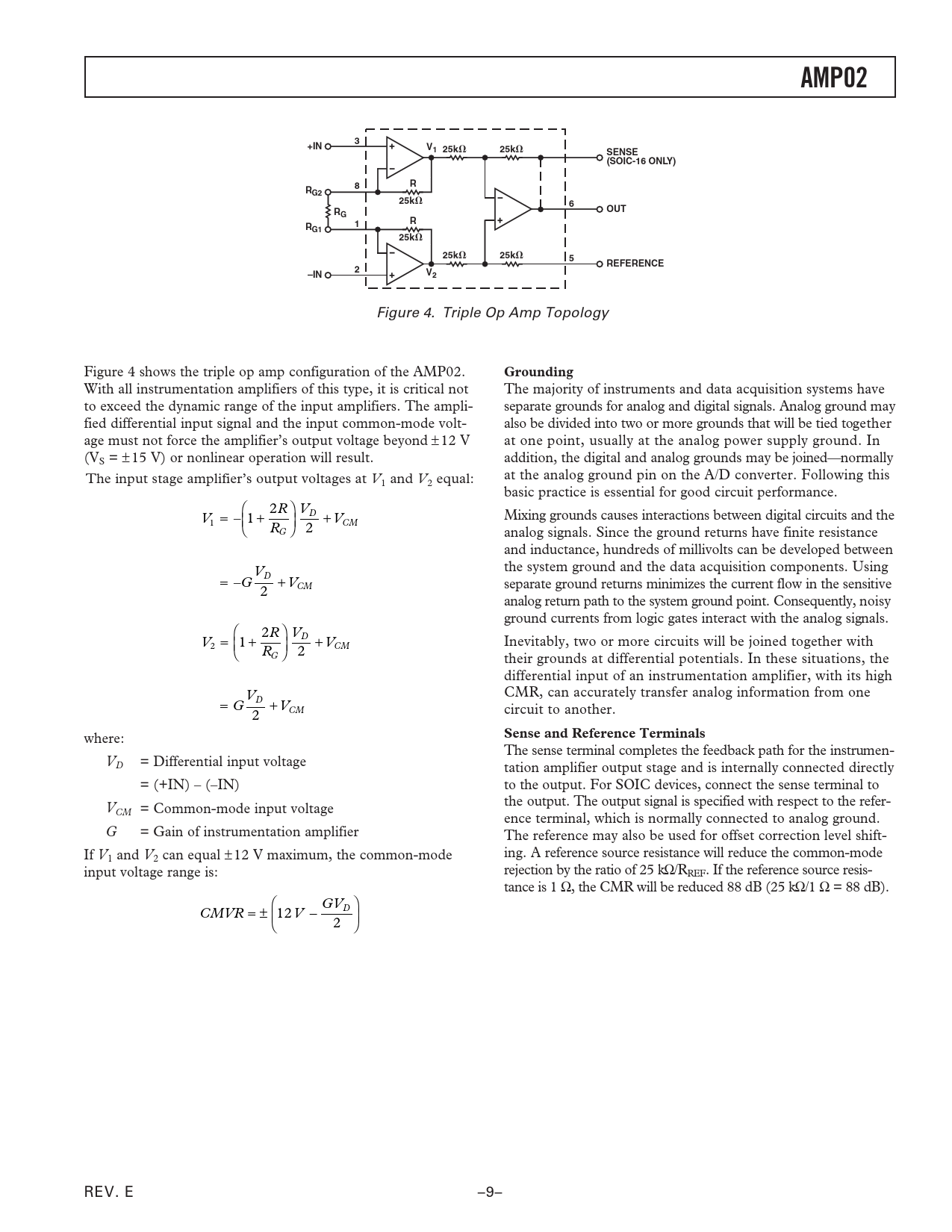 AMP02. +IN. V1 25k. 25k. SENSE (SOIC-16 ONLY). RG2. OUT. REFERENCE. –IN. Grounding. Sense and Reference Terminals