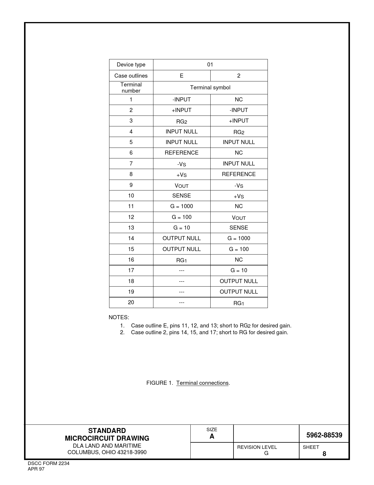 Device type 01 Case outlines E 2 Terminal Terminal symbol number 1 -INPUT NC 2 +INPUT -INPUT 3 RG2 +INPUT 4 INPUT NULL RG2 5 INPUT NULL INPUT NULL 6 REFERENCE NC 7 -VS INPUT NULL 8 +VS REFERENCE 9 VOUT -VS 10 SENSE +VS 11 G = 1000 NC 12 G = 100 VOUT 13 G = 10 SENSE 14 OUTPUT NULL G = 1000 15 OUTPUT NULL G = 100 16 RG1 NC 17 --- G = 10 18 --- OUTPUT NULL 19 --- OUTPUT NULL 20 --- RG1 NOTES: 1. Case outline E, pins 11, 12, and 13; short to RG2 for desired gain. 2. Case outline 2, pins 14, 15, and 17; short to RG for desired gain. FIGURE 1. Terminal connections.