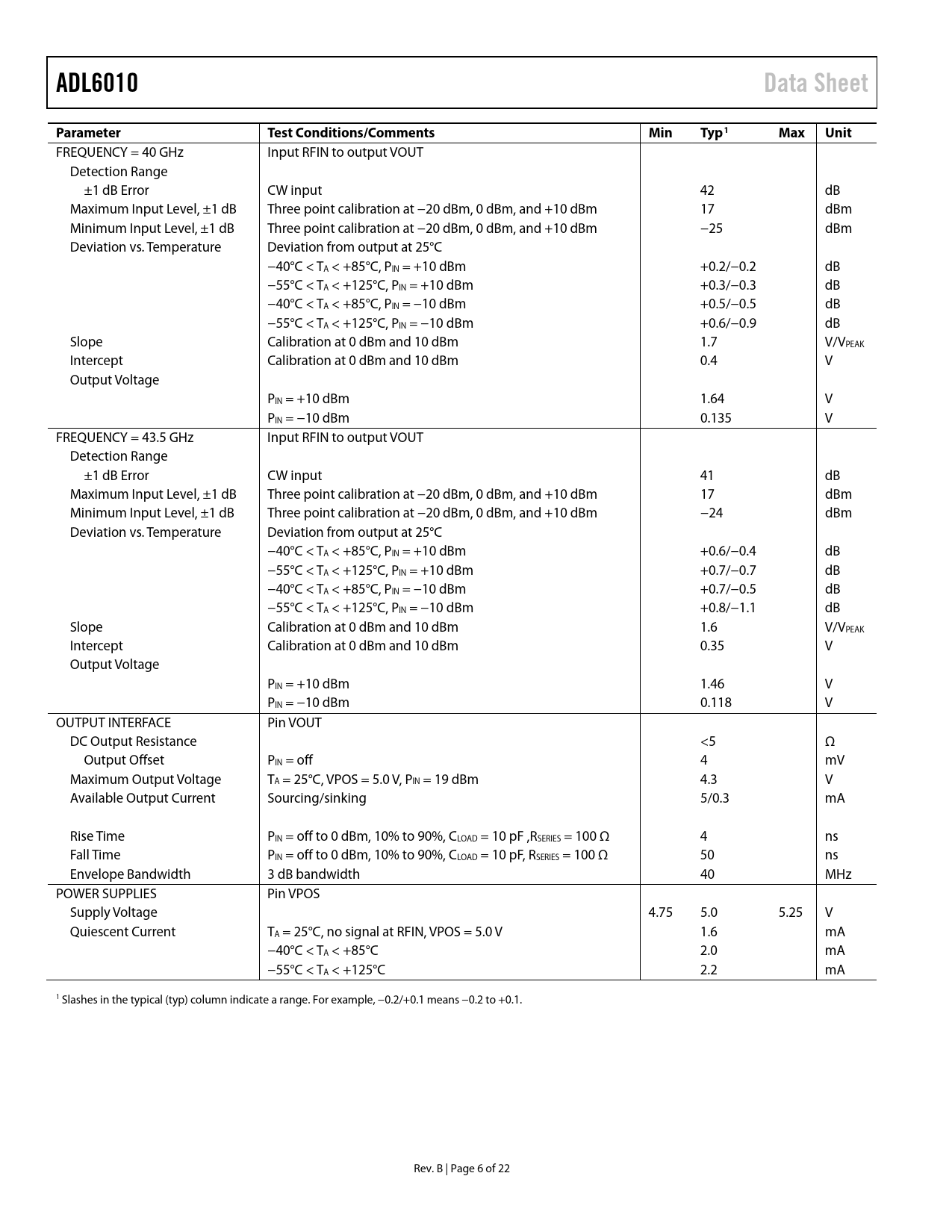 Pages / Page22 / 6 — ADL6010. Data Sheet. Parameter. Test Conditions/Comments. Min. Typ1. Max. …