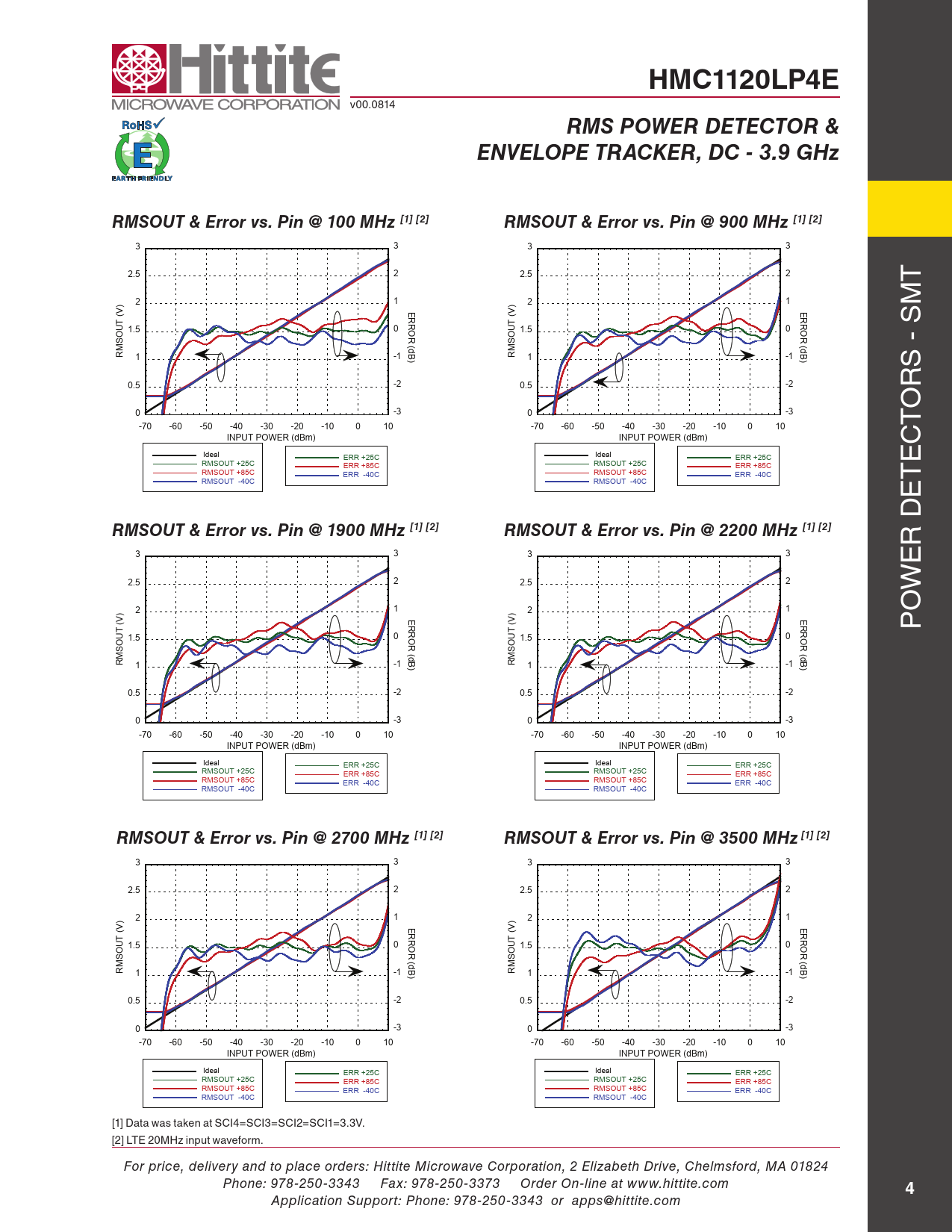Application Support: Phone: 978-250-3343 or apps@hittite.com Document Outline Typical Applications Features Functional Diagram General Description Typical Performance Characteristics Electrical Specifications RMSOUT Error vs. Pin with Different Modulations @ 1900 MHz RMSOUT & Error vs. Pin @ 500 MHz RMSOUT & Error vs. Pin @ 900 MHz RMSOUT & Error vs. Pin @ 1900 MHz RMSOUT & Error vs. Pin @ 2200 MHz RMSOUT & Error vs. Pin @ 2700 MHz RMSOUT & Error vs. Pin @ 3500 MHz RMSOUT Intercept vs. Frequency RMSOUT Slope vs. Frequency RMSOUT vs. Pin with WCDMA 4 Carrier @ +25 °C RMSOUT Error vs. Pin with WCDMA 4 Carrier @ +25 °C RMSOUT Error vs. Pin with WCDMA 4 Carrier @ +85 °C wrt +25 °C Response RMSOUT vs. Pin with CW @ +25 °C RMSOUT Error vs. Pin with CW @ +25 °C RMSOUT vs. Pin w/ CW & WCDMA 4 Carrier @ 1900 MHz & +25 °C Reading Error for WCDMA 4 Carrier wrt CW Response @ +25 °C RMSOUT vs. Pin w/ CW & WCDMA 4 Carrier @ 1900 MHz & +85 °C Reading Error for WCDMA 4 Carrier wrt CW Response @ +85 °C RMSOUT vs. Pin w/ CW & WCDMA 4 Carrier @ 1900 MHz & -40 °C Reading Error for WCDMA 4 Carrier wrt CW Response @ -40 °C RMSOUT Output Response with SCI = 0000 @ 1900 MHz RMSOUT Output Response with SCI = 1100 @ 1900 MHz Typical Supply Current vs. Pin, Vcc = 3.3V Input Return Loss vs. Frequency Output Ripple & Rise/Fall Time vs. Integration Setting [Sci4,Sci3,Sci2,Sci1] in Decimal ETOUT vs. Vin with CW @ 900 MHz ETOUT & ETOUT Error vs. Pin with CW @ 900 MHz ETOUT vs. Vin with CW @ 1900 MHz ETOUT & ETOUT Error vs. Pin with CW @ 1900 MHz ETOUT vs. Pin with CW @ 2200 MHz ETOUT & ETOUT Error vs. Pin with CW @ 2200 MHz ETOUT vs. Pin with CW @ 2700 MHz ETOUT & ETOUT Error vs. Pin with CW @ 2700 MHz ETOUT vs. Pin with CW @ 3500 MHz ETOUT & ETOUT Error vs. Pin with CW @ 3500 MHz ETOUT & ETOUT Error vs. Pin with CW @ 3900 MHz ETOUT vs. Pin with CW @ 3900 MHz ETOUT Intercept vs. Frequency with CW ETOUT Slope vs. Frequency with CW Absolute Maximum Ratings Outline Drawing Package Information Pin Descriptions Evaluation PCB Evaluation Order Information List of Materials for Evaluation PCB Application Circuit Application Information Principle of Operation Configuration For The Typical Application Broadband Single-Ended Input Interface Envelope Detector Output RMS Output Interface and Transient Response LOG-Slope and Intercept DC Offset Compensation Loop Standby Mode Modulation Performance - Crest factor performance System Calibration Layout Considerations Definitions