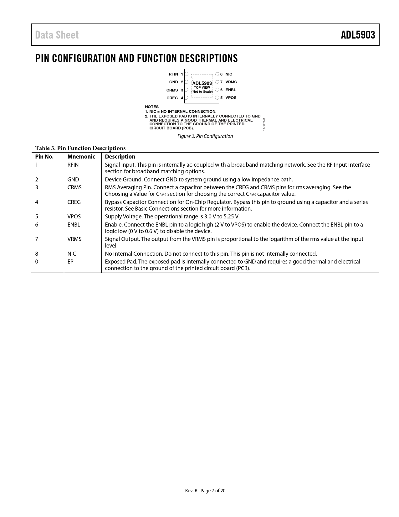 Data Sheet. ADL5903. PIN CONFIGURATION AND FUNCTION DESCRIPTIONS. RFIN 1. 8 NIC. GND 2. 7 VRMS. TOP VIEW. CRMS 3. 6 ENBL. (Not to Scale)